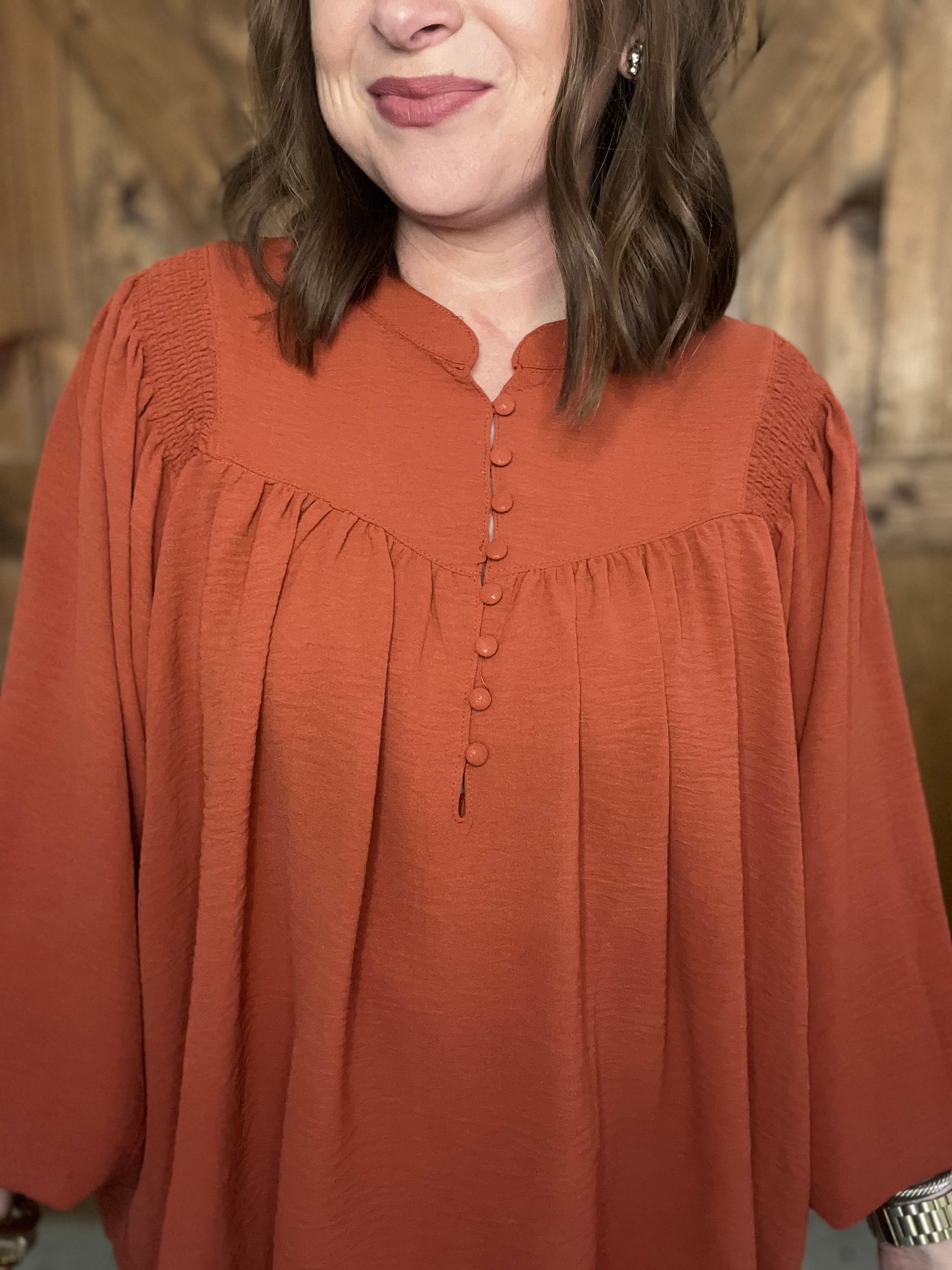 Discover the perfect blend of style and comfort with our Blessings Top in Spice. Featuring a smocked button-up design and long sleeves, this woven top adds a touch of elegance to any outfit. Embrace the blessings of effortless fashion and add this versatile piece to your wardrobe today!
