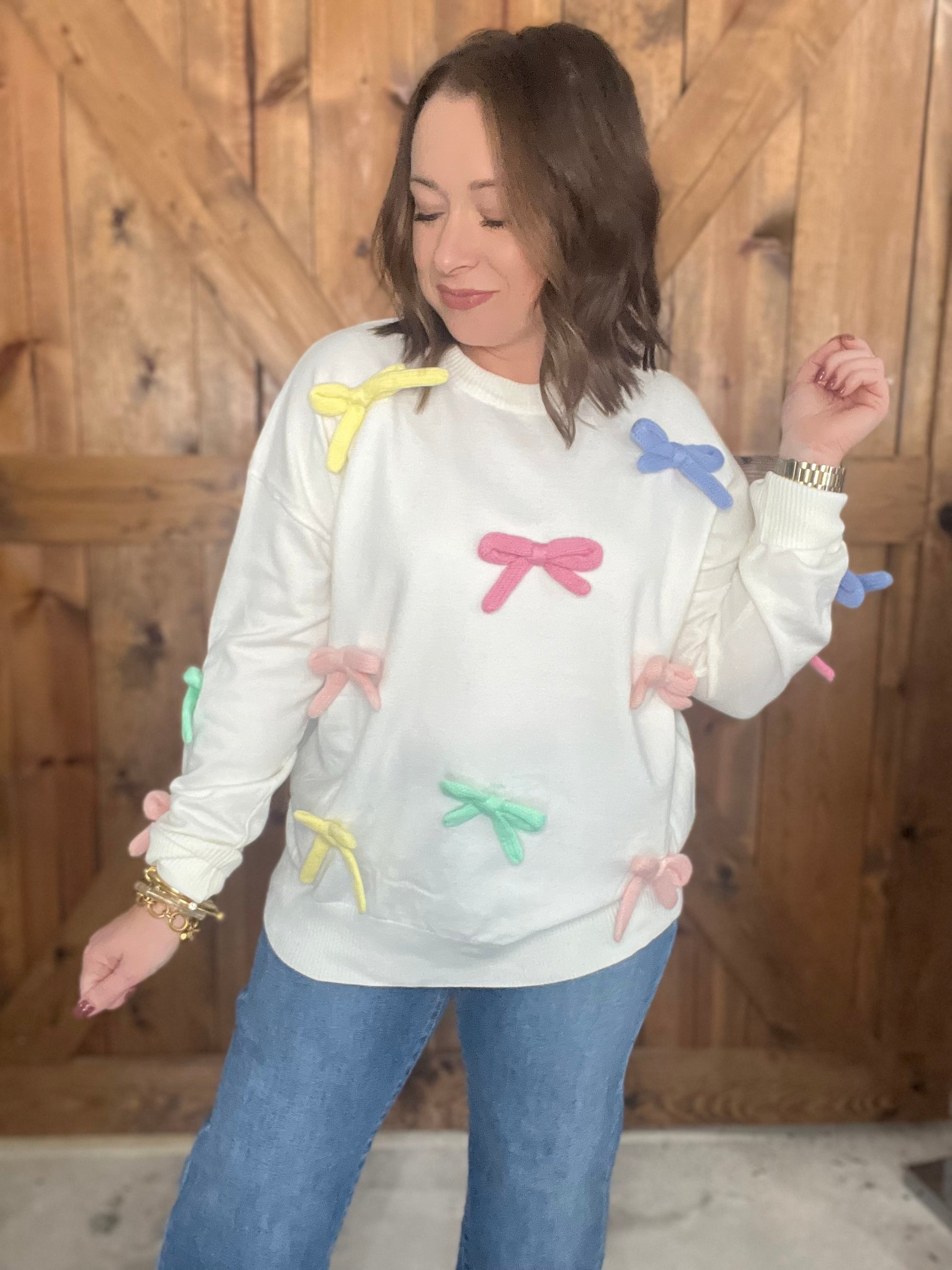 Cozy up in this charming crew neck knit sweater that's anything but basic! Featuring delicate ribbon trim adorning the front and sleeves in a rainbow of colors, this piece brings a whimsical touch to your everyday wardrobe. The soft, comfortable knit keeps you warm while the colorful ribbon details add personality and flair. Perfect for layering or wearing solo, this sweater proves that the sweetest style comes with a bow.