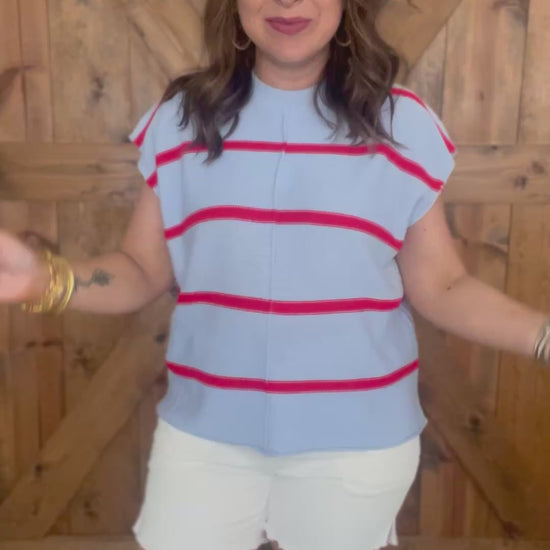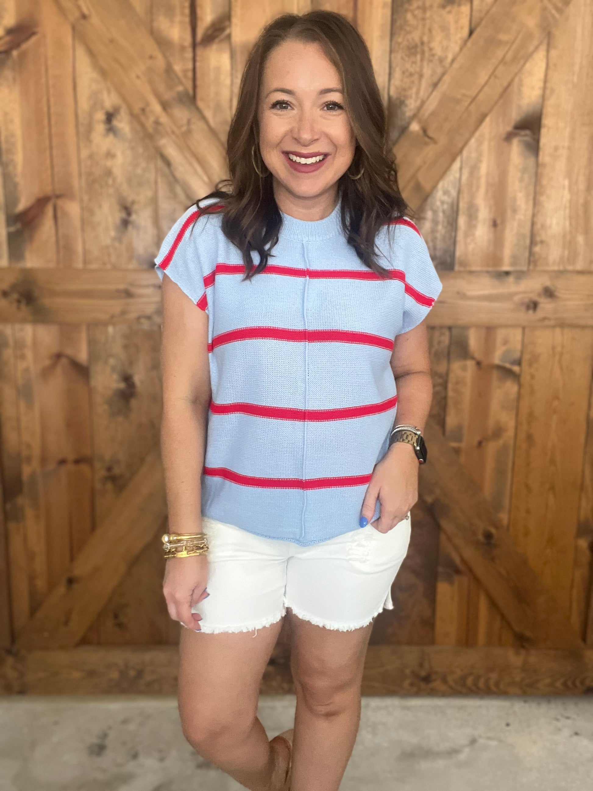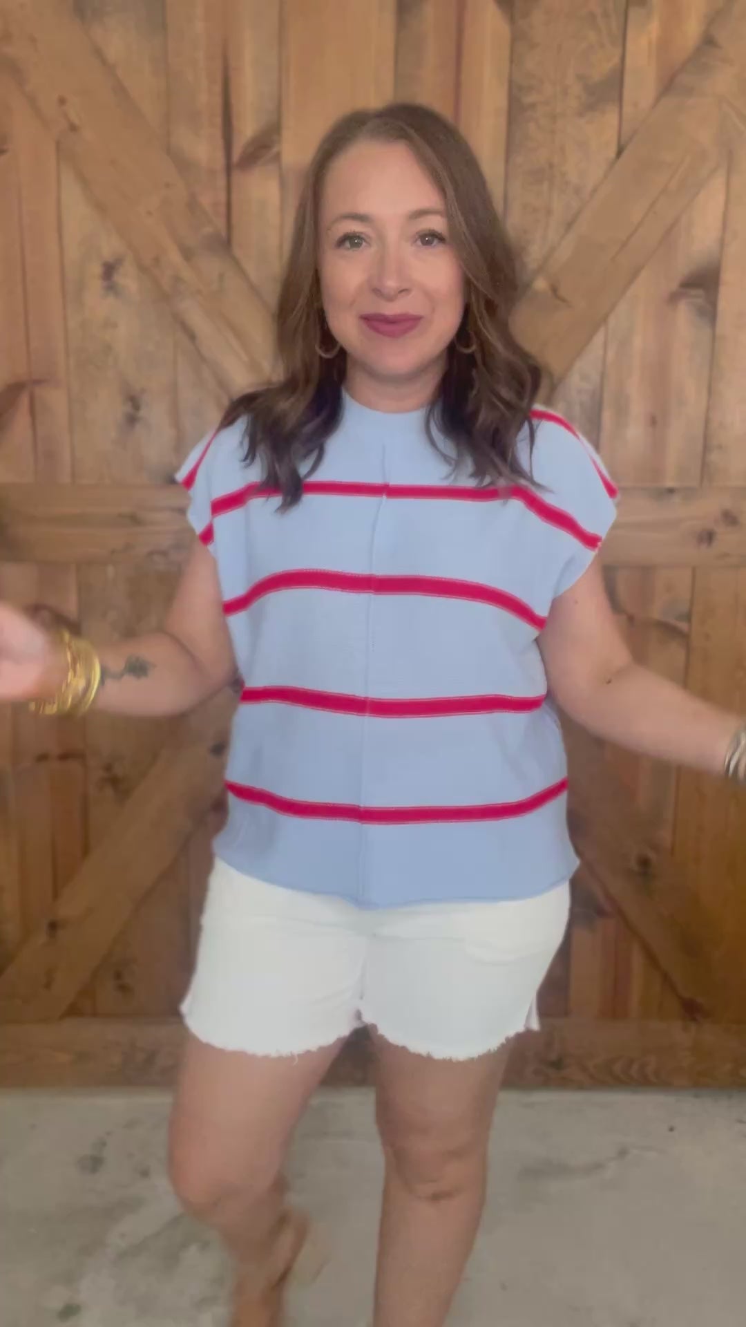 The Coastal Vibe Sweater brings a fresh, nautical-inspired look with its sky blue and red stripes. Designed with a comfortable round neck and flattering cap sleeves, this sweater top offers both style and ease. Perfect for adding a pop of color to your casual wardrobe, it’s an ideal choice for effortless, chic layering.