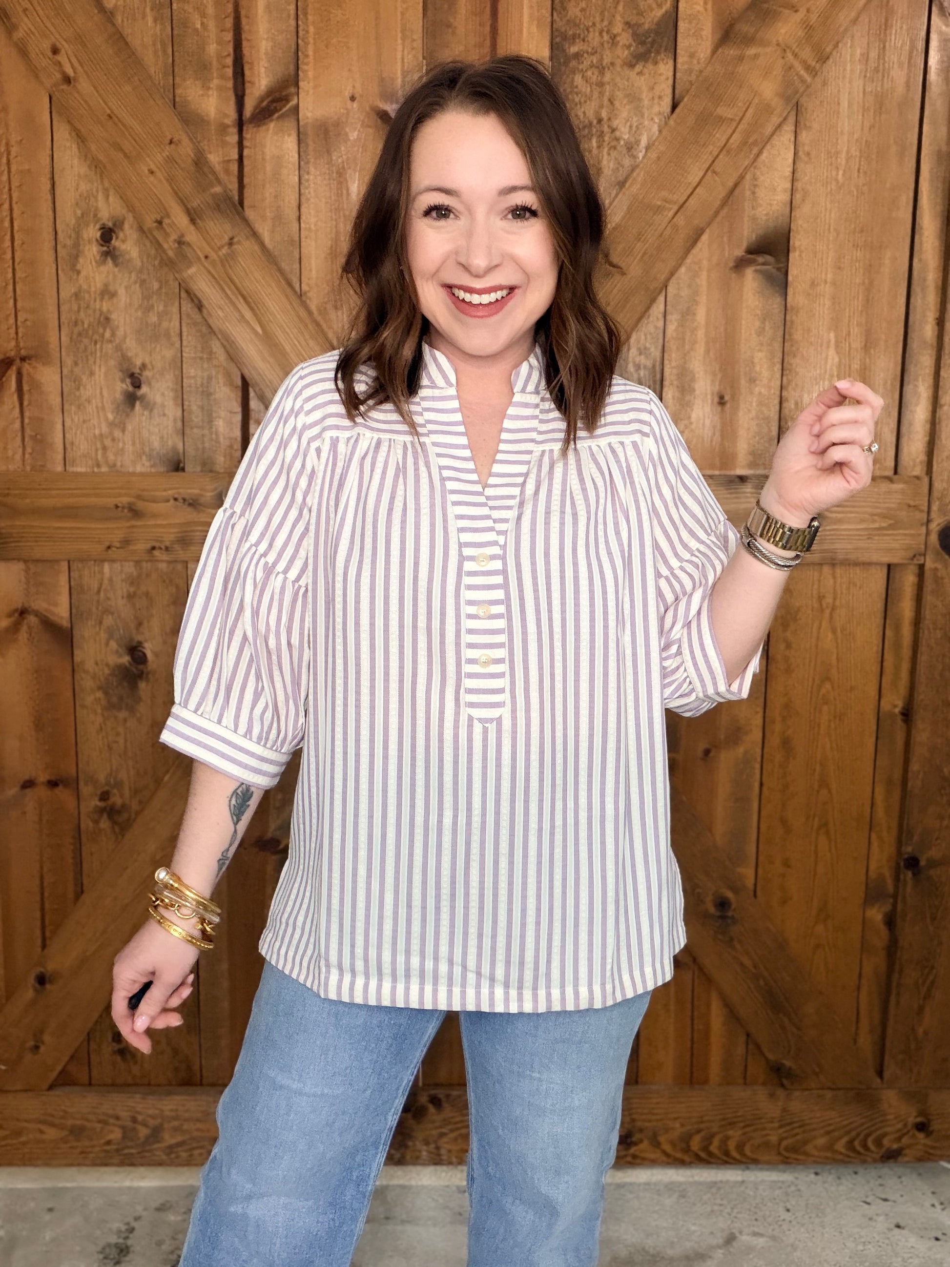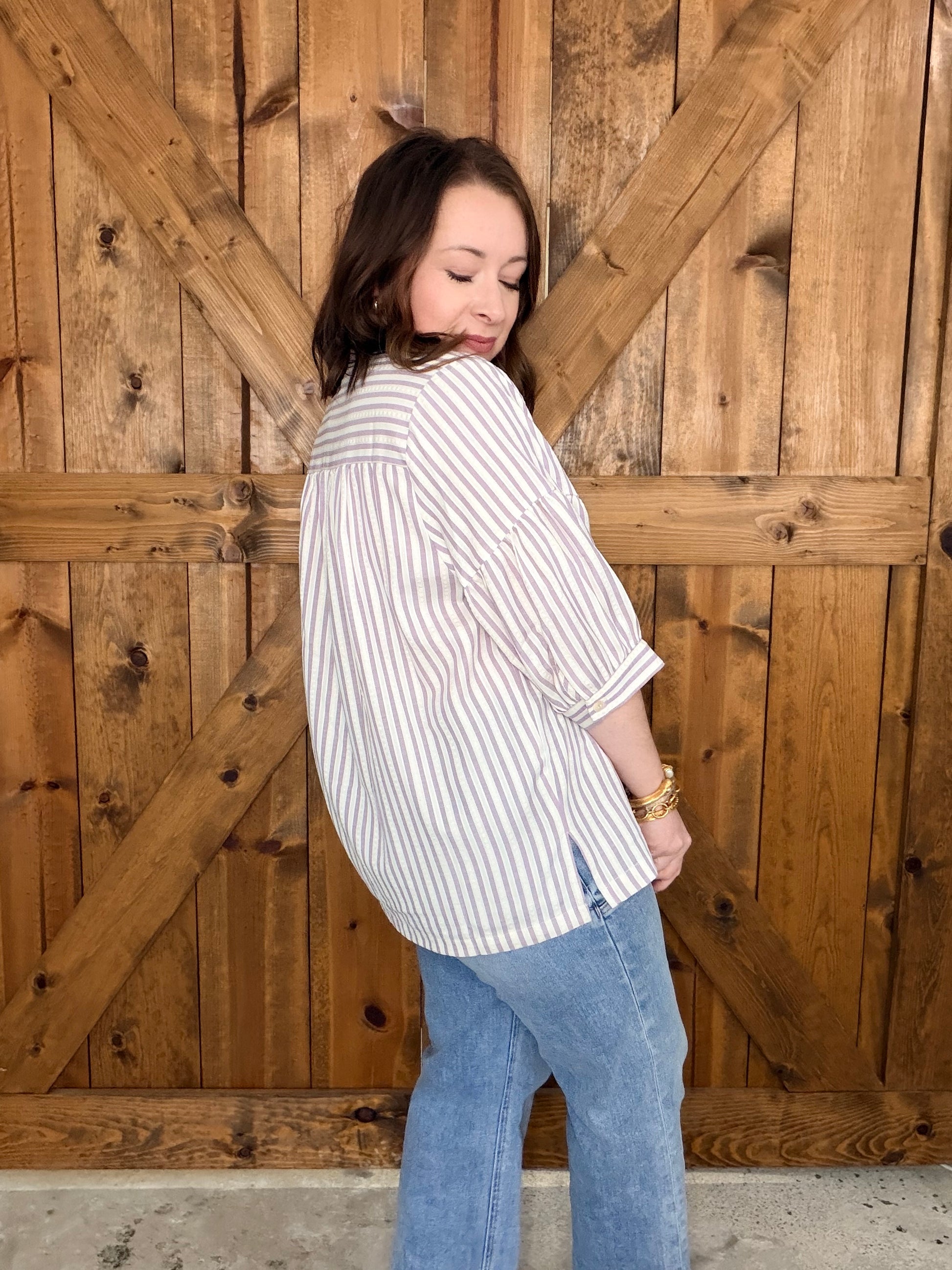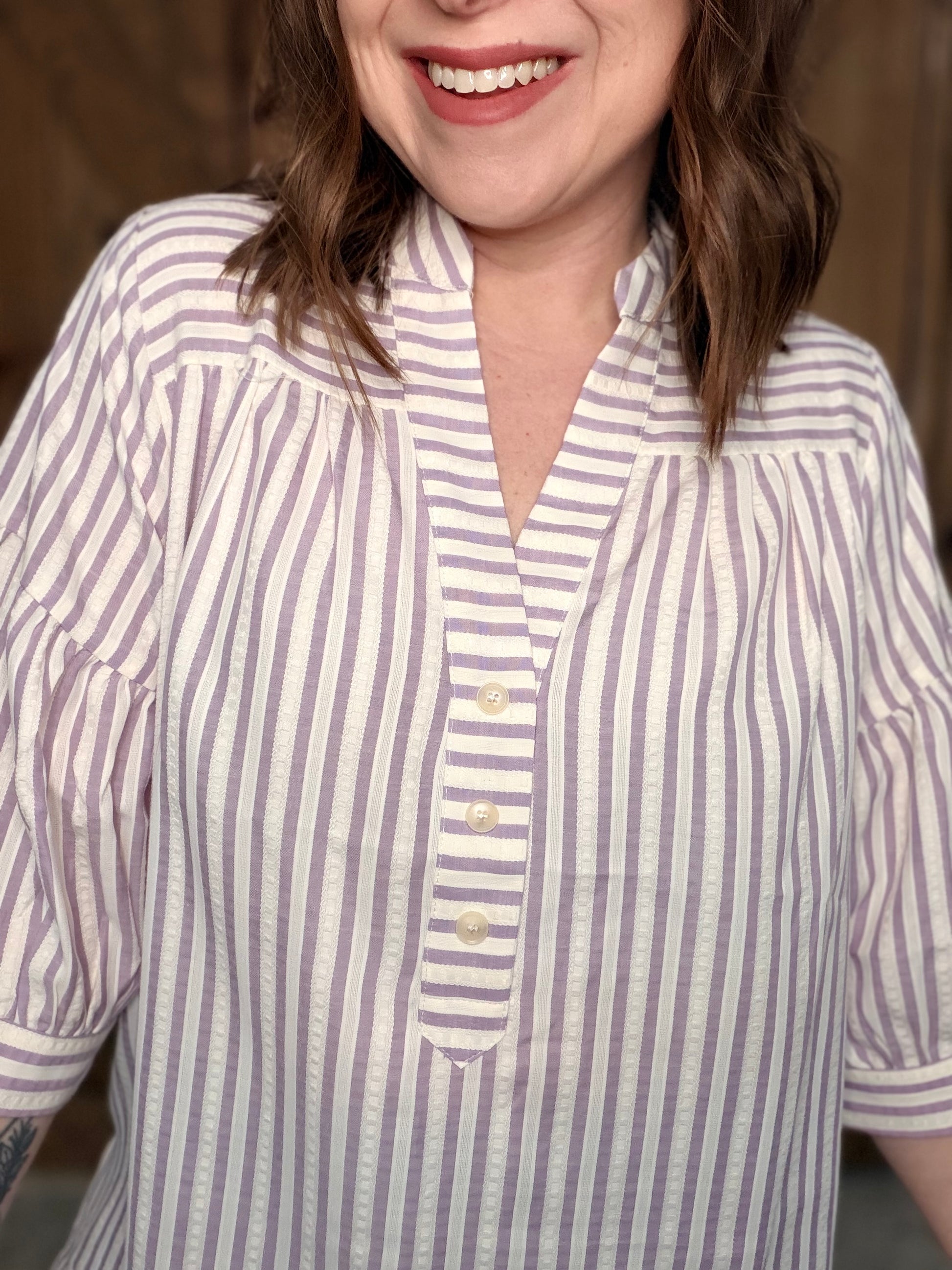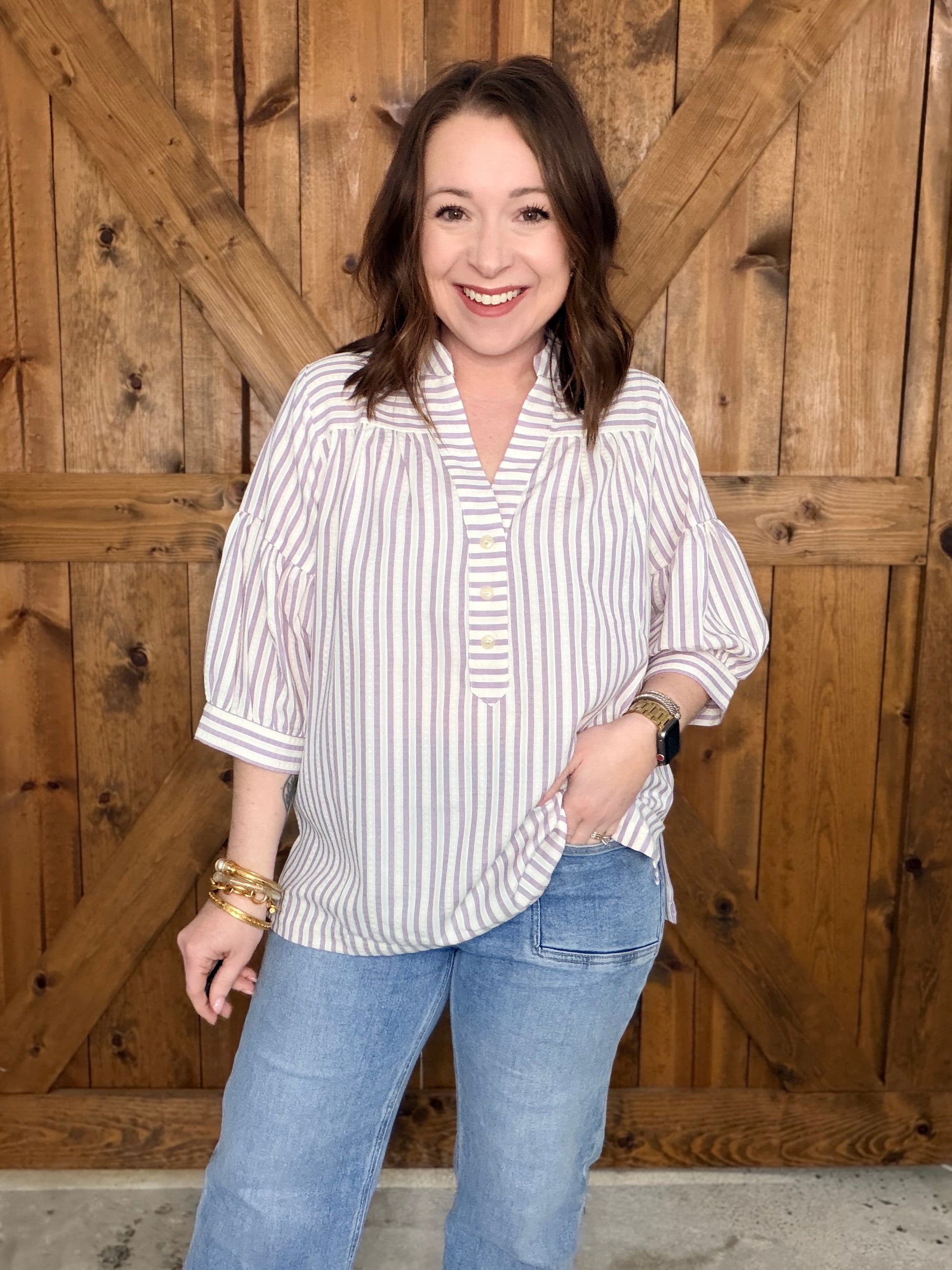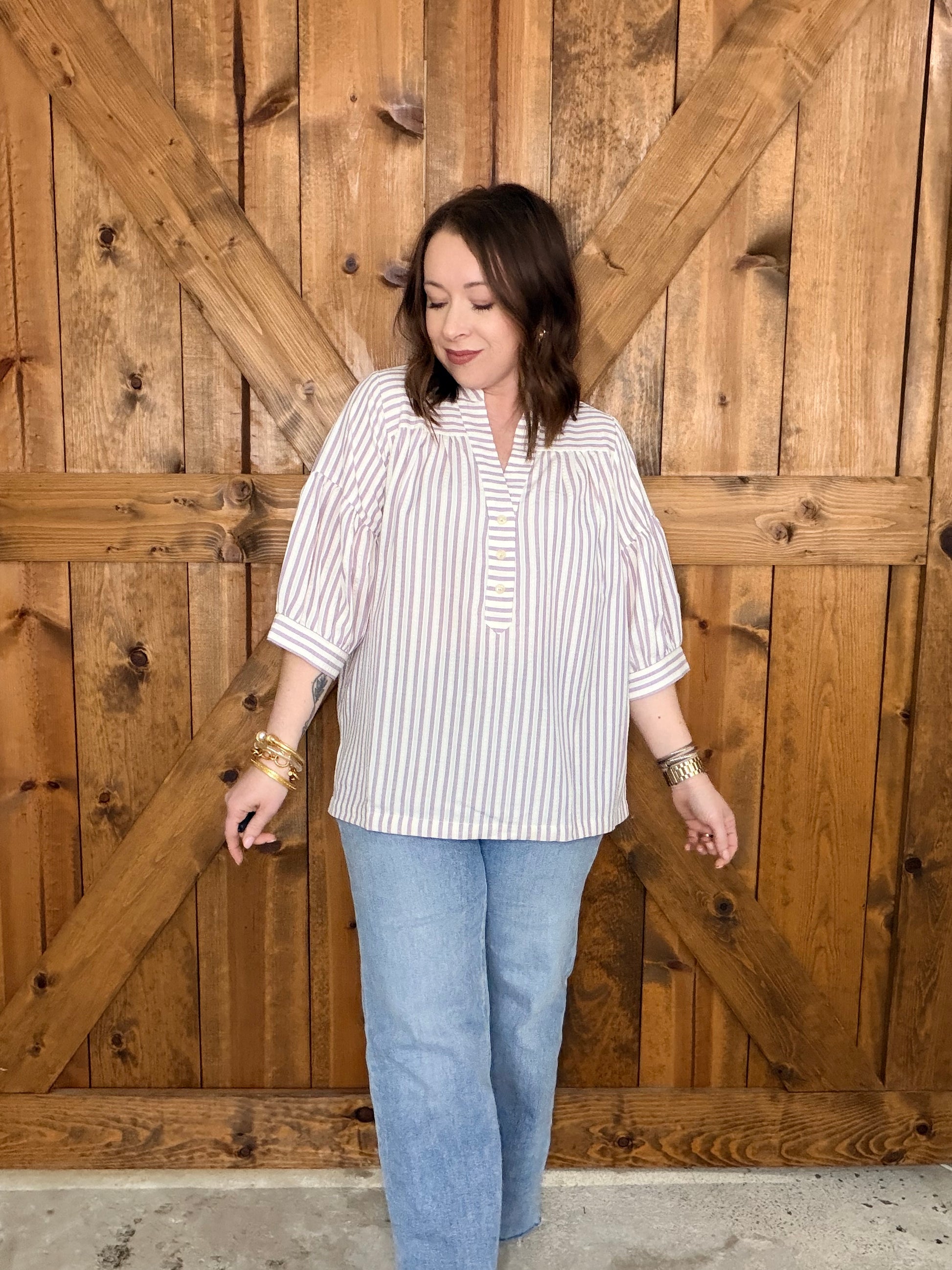 Meet your new wardrobe favorite—the Don't Be Shy Top! This breezy pullover combines soft, lightweight woven fabric with a cheeky split V-neckline and partial button placket for easy styling. Adorable elbow-length puff sleeves with gathered cuffs bring that sweet, feminine vibe, while strategically placed back yoke gathers ensure you can move freely and comfortably. Whether you're beating the heat solo or layering it up, this striped stunner does it all with playful charm.