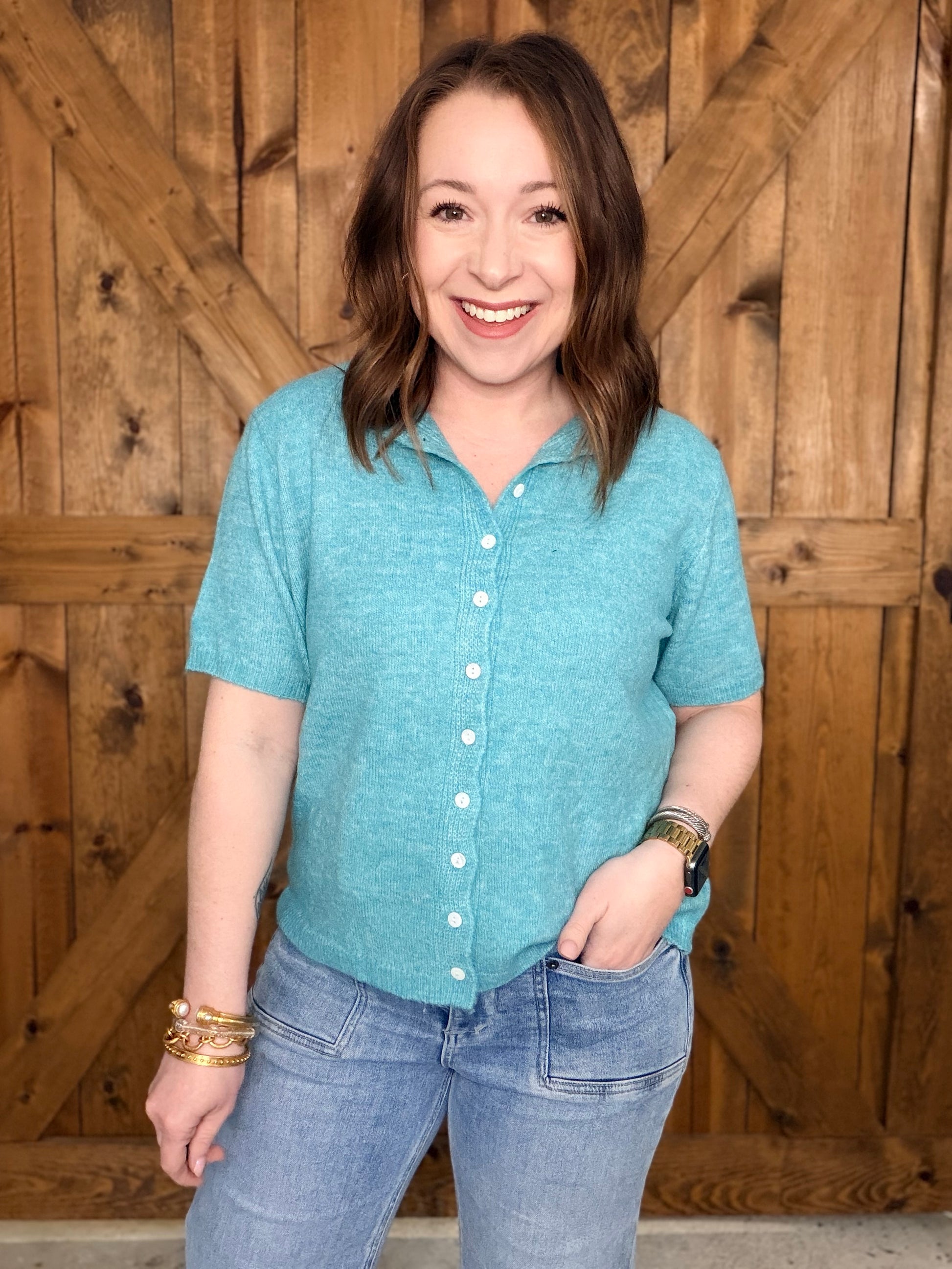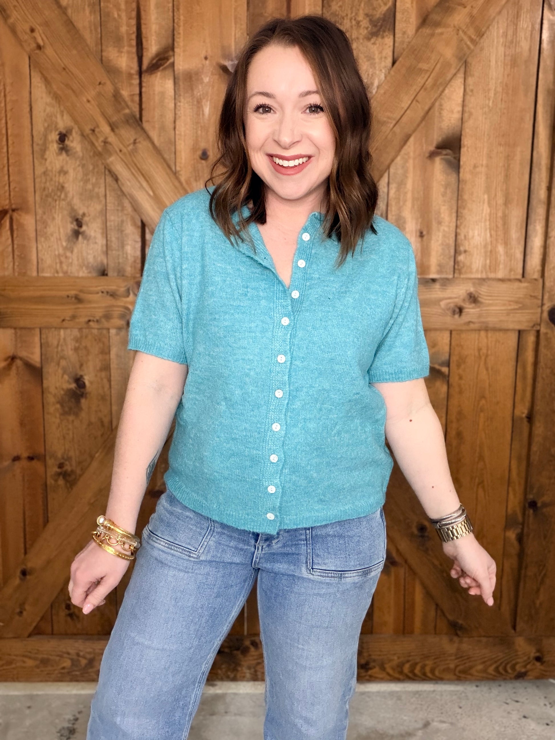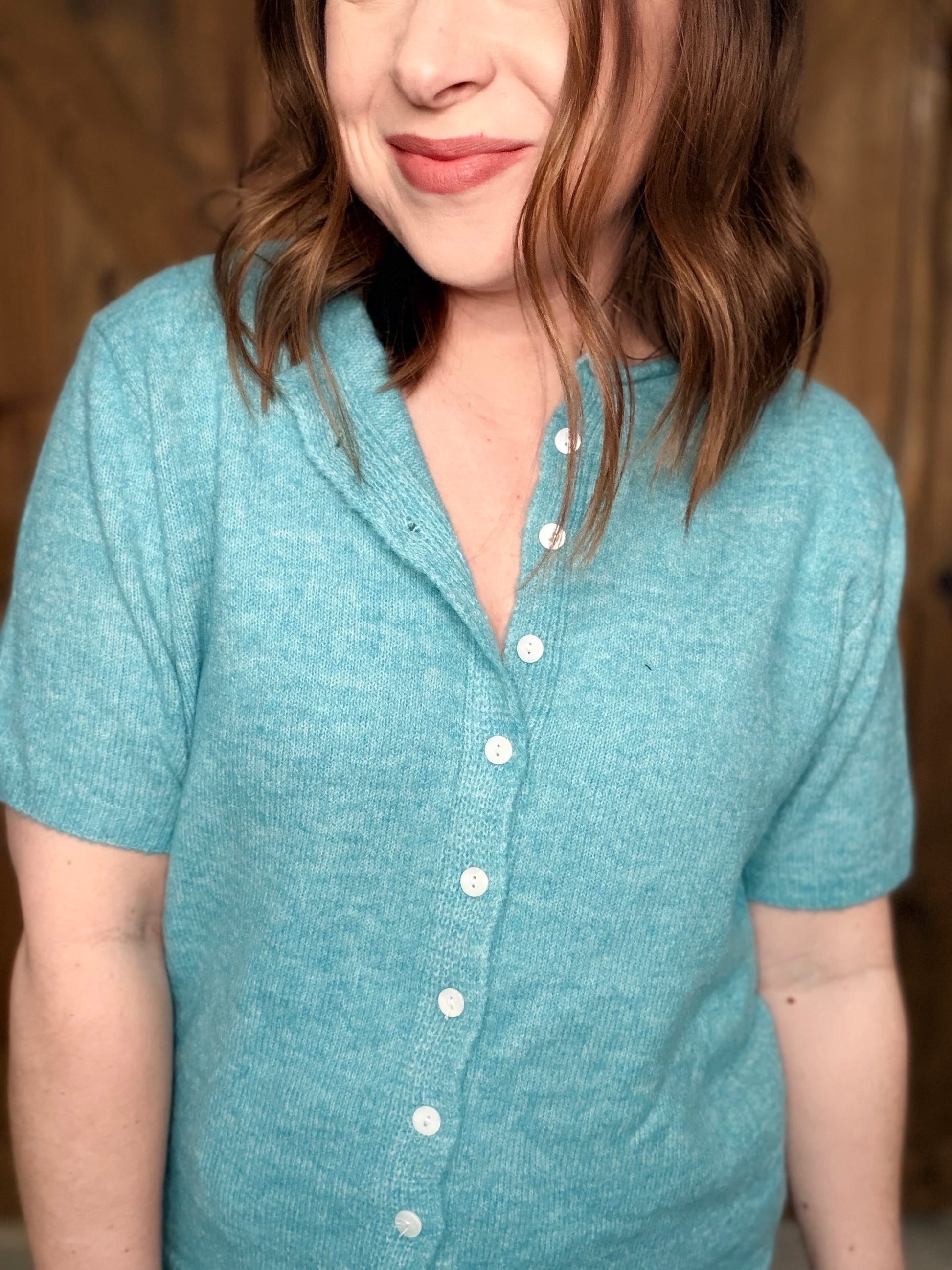 Throw on the Don't Mind If I Do Sweater and embrace pure comfort. This breezy short-sleeve cardigan features a button-down front and relaxed fit that works year-round—whether you're layering it over a dress or wearing it solo as a lightweight top. Subtle ribbed edges keep things polished while the cozy-yet-breathable fabric makes it your go-to for effortless style from spring through fall and beyond. Simple, versatile, and always ready for whatever the day brings.