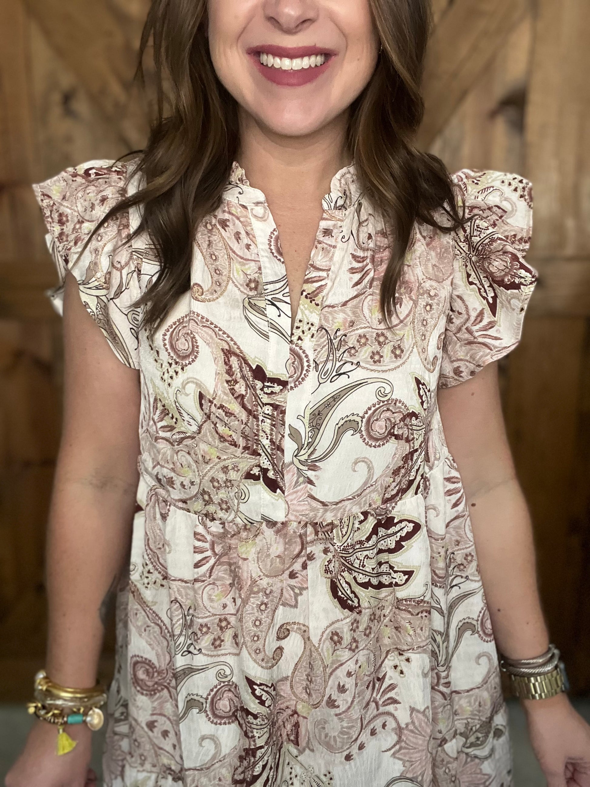 Step into the season with the Fall Spice Midi Dress in Cream, featuring a playful paisley print and a relaxed silhouette that flatters every figure. Its tiered skirt dances with every step, while the split neckline adds a cheeky touch of elegance. Feminine ruffle sleeves bring a soft, stylish flair, making this dress perfect for cozy autumn days or festive gatherings.