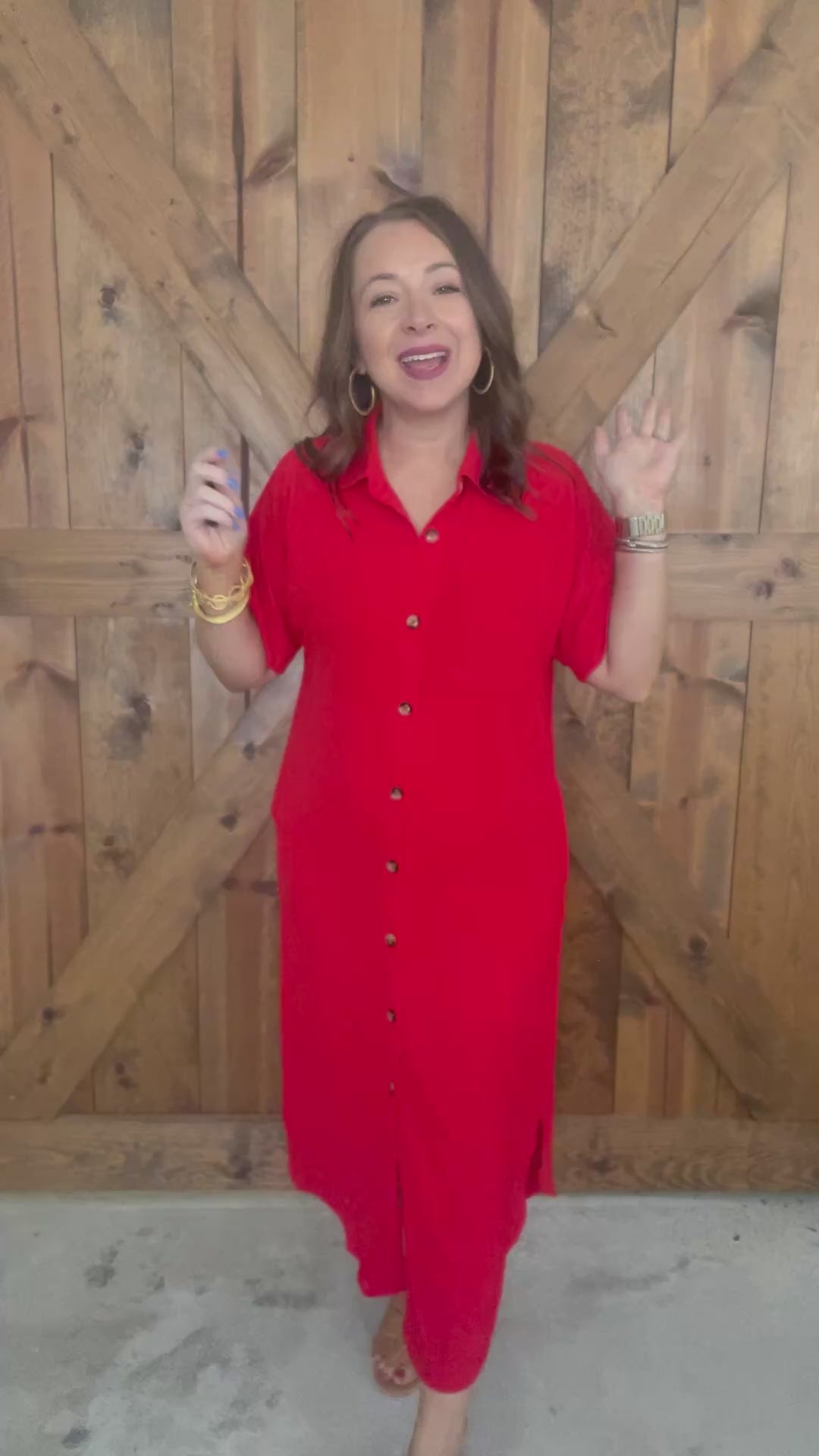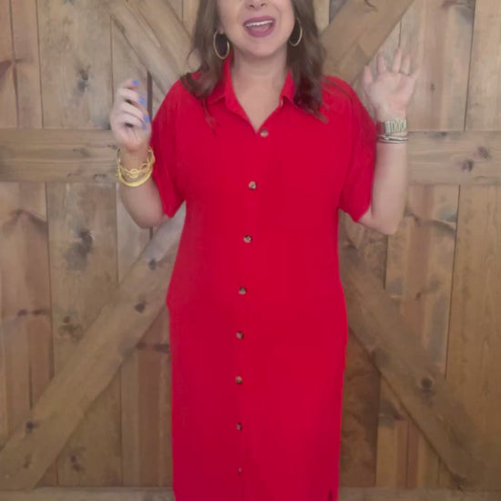 This Firecracker Dress in vibrant red offers a flattering midi length with a comfortable collared neck and practical chest pocket. Designed with short kimono sleeves and band cuffs, it provides ease of movement and a stylish silhouette. The button-front closure and lightweight, non-sheer fabric ensure both coverage and breathability. Side pockets add convenient storage, while the curved hemline enhances its feminine shape. Perfect for everyday wear, this dress combines functionality with effortless style.