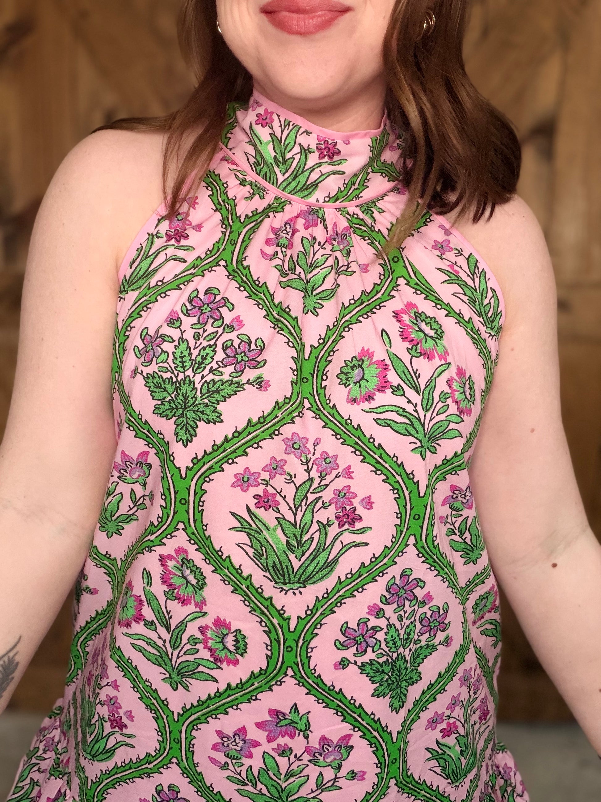 All the girly details we love 💕 This botanical print mini features a flattering halter neckline with a self-tie bow in the back, a flowy fit, and the cutest ruffle hem. Lightweight, lined, and finished with pockets—because yes, it has everything.