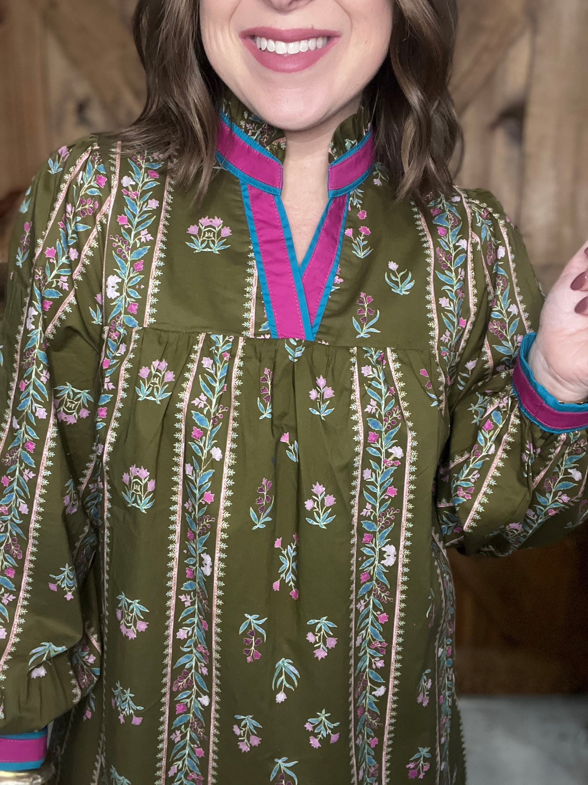 Meet your new favorite dress! This Golden Harvest Dress in kiwi showcases a cheerful floral pattern that's anything but ordinary. The ruffled standing neckline brings instant charm, while long sleeves offer cozy coverage. Hidden side pockets are a game-changer for keeping your hands free, and the solid contrast details add a fun finishing touch. Whether you're heading to brunch or a weekend adventure, this playful dress delivers comfort and style in one delightful package.