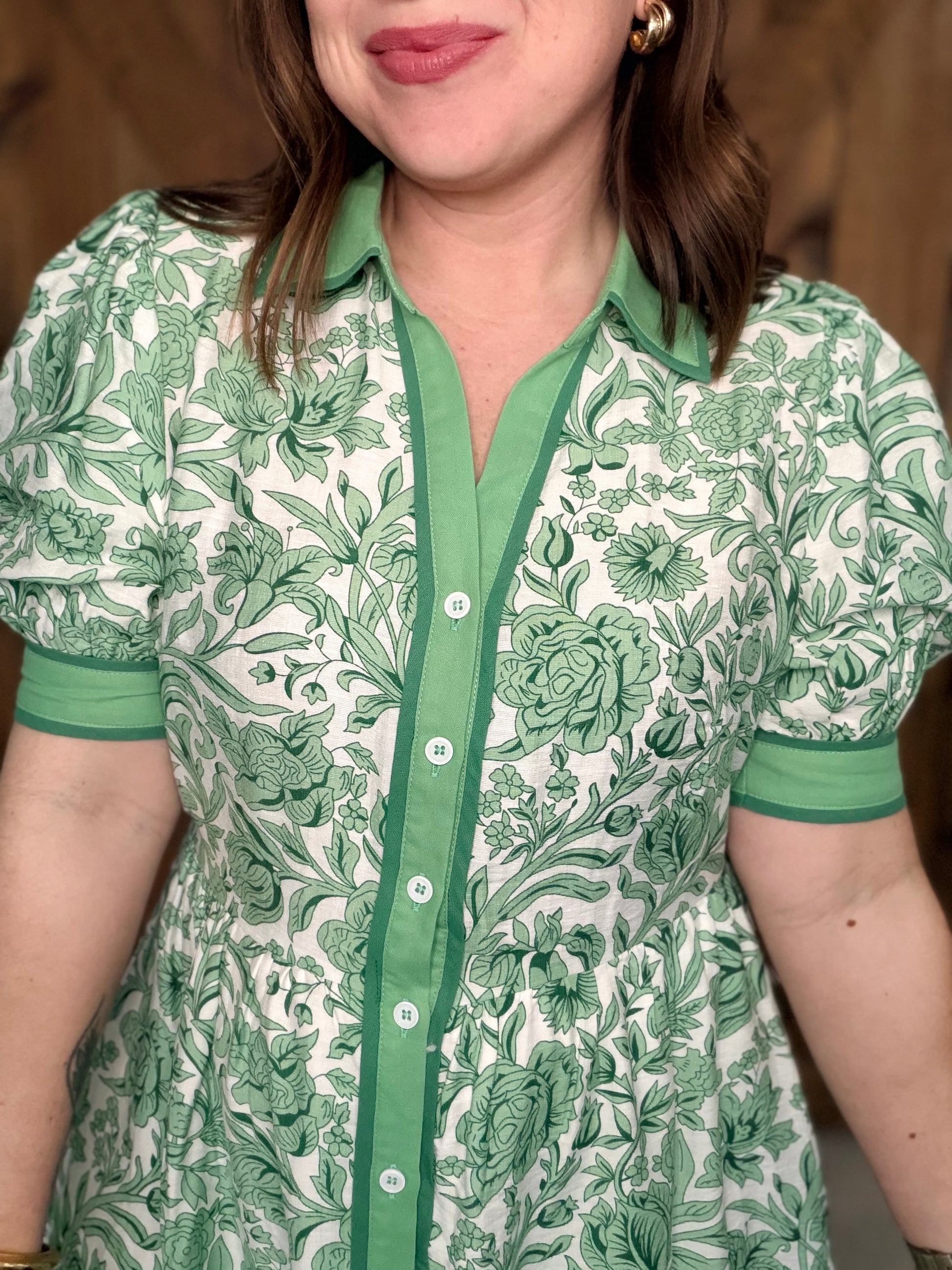 Introducing the Green Ivy Dress—your new go-to for effortless style! This charming floral midi shirt dress features a full button-down front and playful short puff sleeves with folded cuffs that add just the right amount of personality. The contrasting trim along the collar, placket, and cuffs brings crisp definition to the design, while the midi length keeps things polished and versatile. Best of all? Functional side pockets mean you can ditch the bag and embrace the freedom. Perfect for everything from weekend brunch to casual office days, this dress proves that comfort and style go hand in hand.