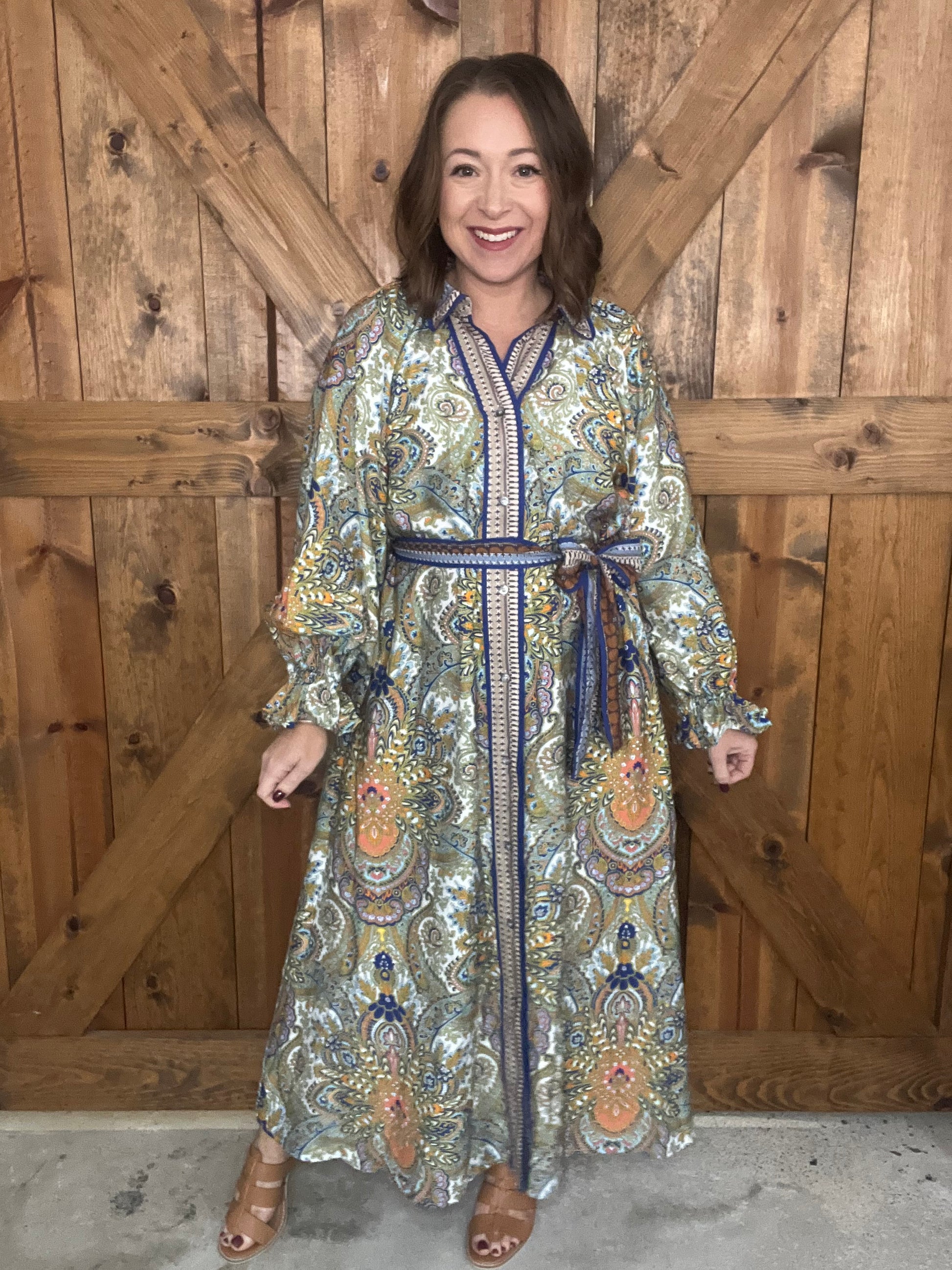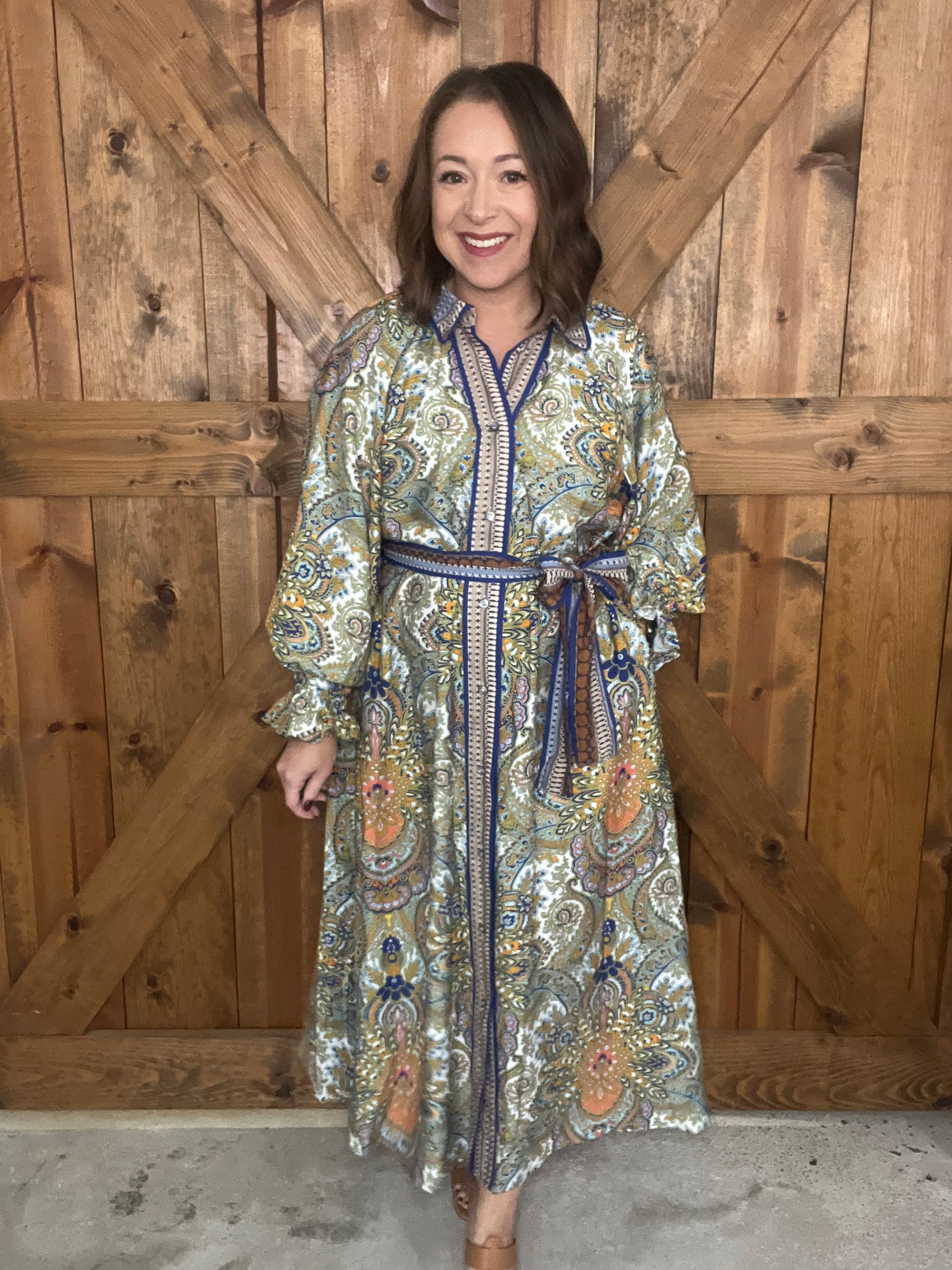Discover effortless sophistication with this paisley mixed print belted midi shirt dress—a wardrobe essential that works as hard as you do. The classic button-down silhouette pairs beautifully with contrast piping for polished detail, while the detachable mixed print tie belt gives you styling flexibility. Wear it cinched for a defined waist or untied for relaxed comfort. Long sleeves and a fully lined interior ensure all-day wearability, and the midi length flatters every frame.