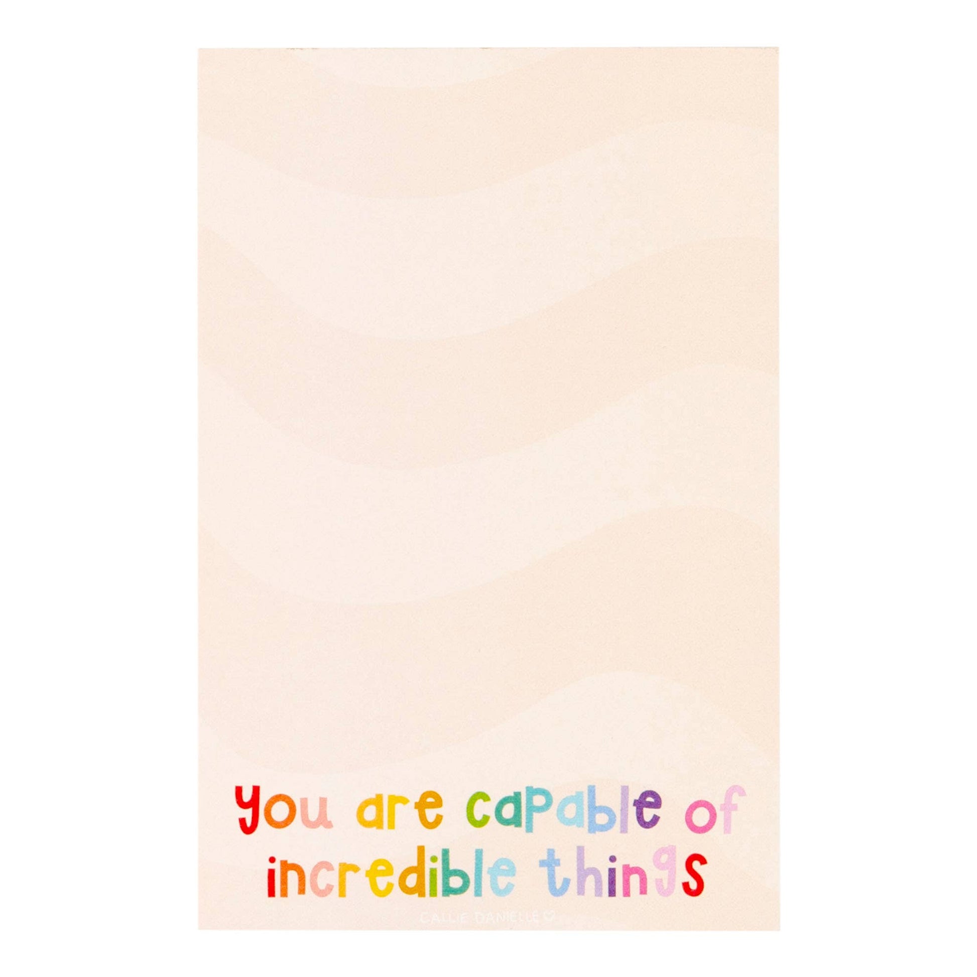 Brighten your day with our Incredible Things Notepad! Featuring the ipiring message "You are capable of incredible things" in colorful letters, this notepad is perfect for jotting down notes, ideas, and reminders. The fun wavy background adds a touch of charm, making it the perfect addition to your desk or workspace. Whether you're at work, school, or home, let this notepad remind you of your amazing potential every day. Stay motivated and organized with this uplifting notepad!