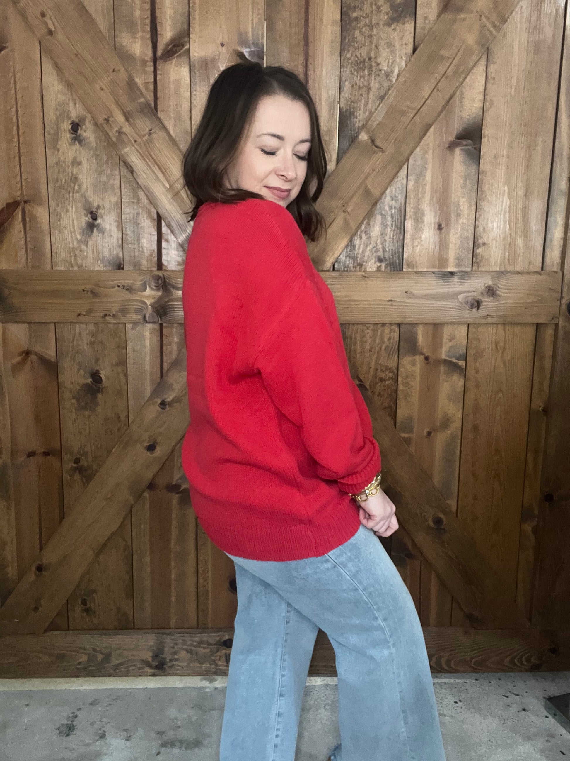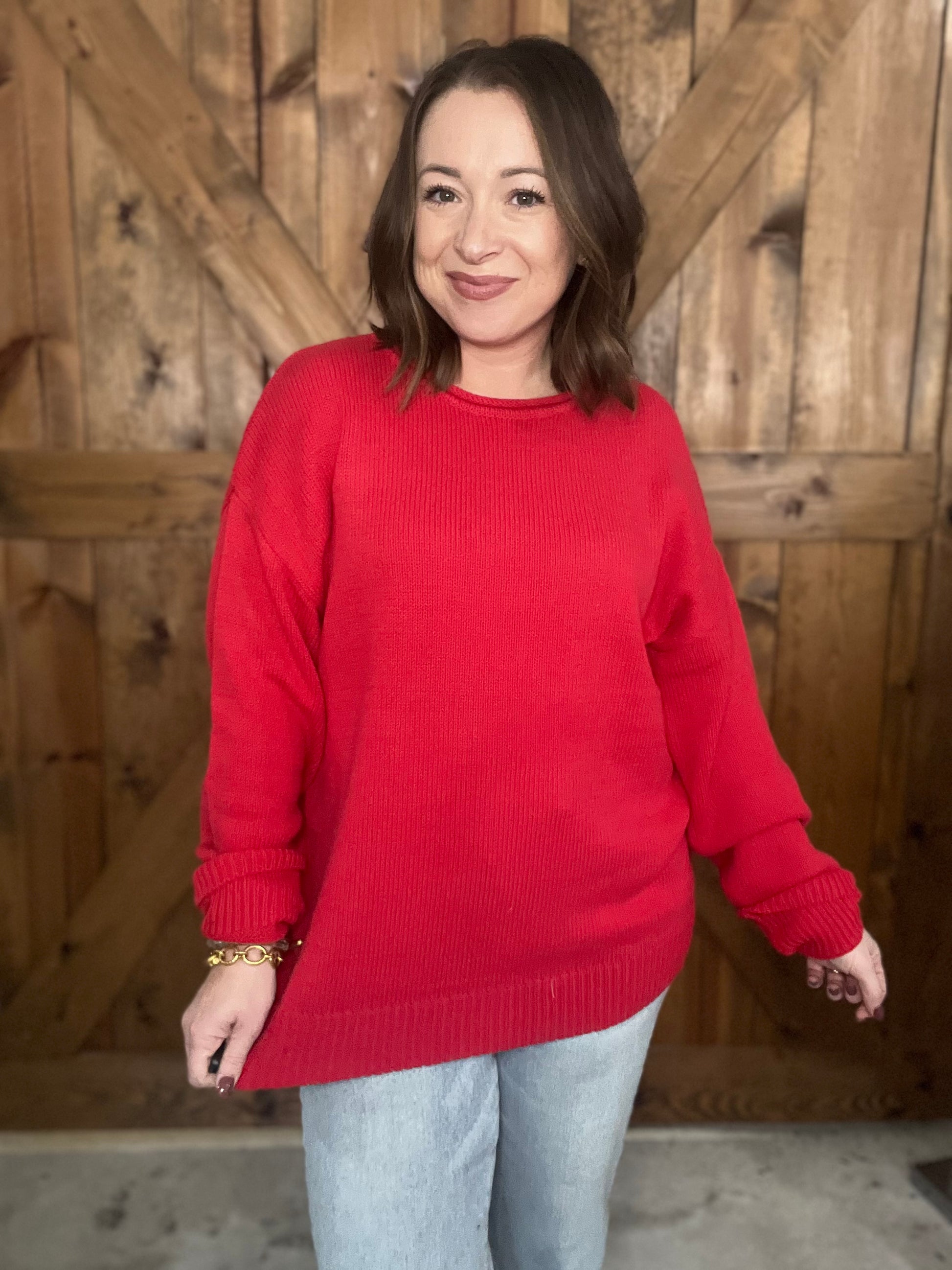 This red oversized sweater is your ticket to looking effortlessly cool without breaking a sweat. The drop shoulders and extra-long sleeves give you that relaxed, modern vibe that says "I woke up like this"—even if you didn't. Pair it with skinny jeans for a fun contrast that actually works, or layer it over a button-down when you want to feel a little more buttoned-up. From lazy Sunday mornings to evening hangouts, this sweater slides into any situation and makes you look like you've got it all figured out.