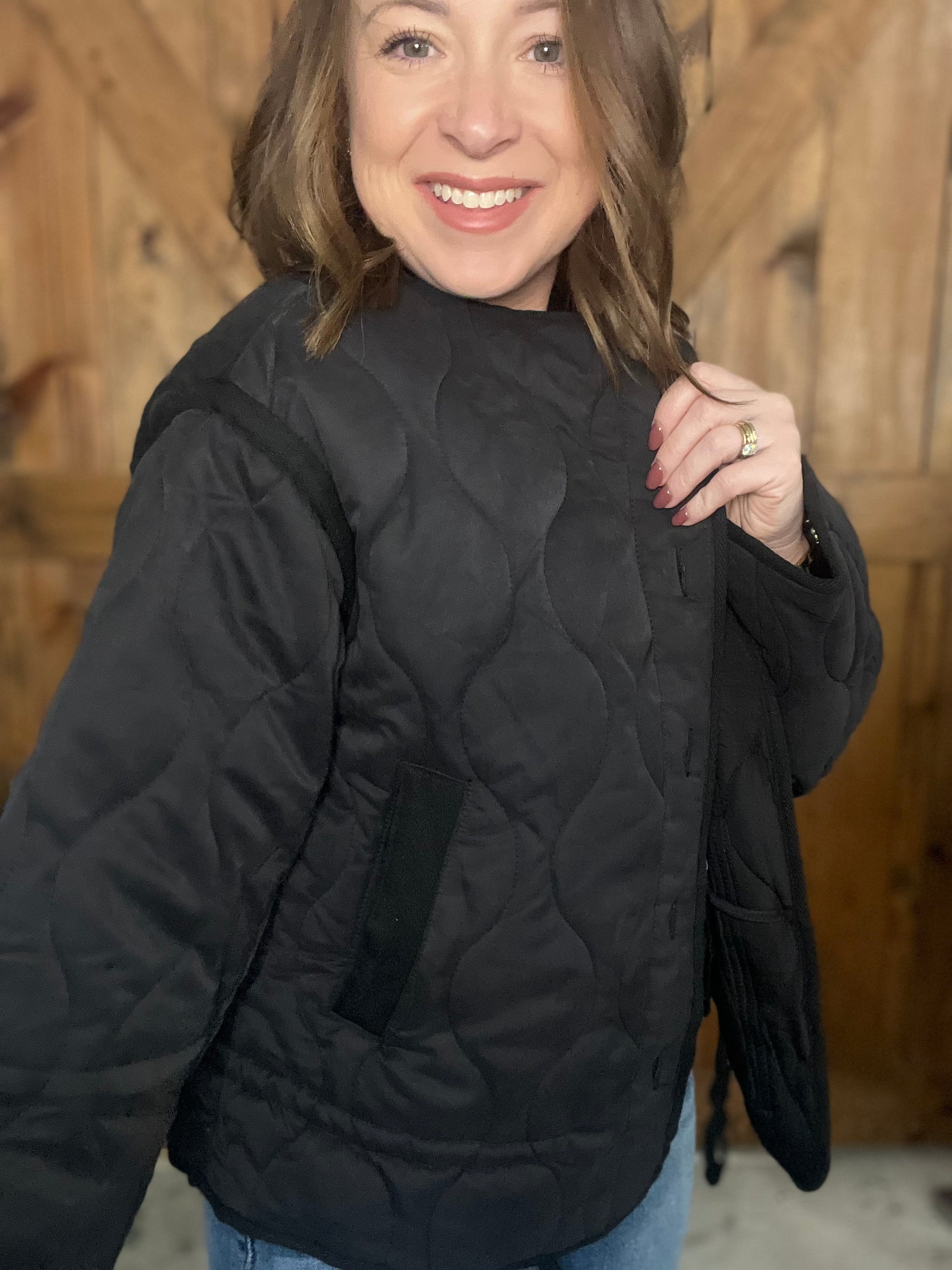Meet your new favorite layer—a quilted black jacket that means business with a fun twist. That peplum hem adds just the right amount of sass to keep things interesting, while the structured design keeps you looking sharp. Throw it over your go-to jeans for a crisp daytime vibe, or pair it with a pencil skirt when you want to feel extra polished. Whether you're braving the cold or just need that perfect finishing touch, this jacket delivers warmth without sacrificing style.