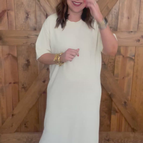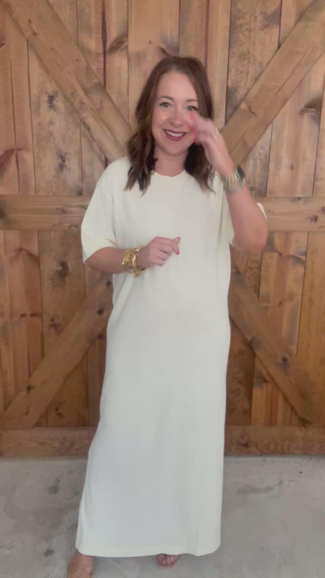 Dance through your day in the Sandy Days Dress in Alpaca! This fun-loving maxi brings the perfect mix of sass and class with its cute crew neckline and breezy short sleeves. The relaxed fit swishes and sways with every step, ending in a fabulous floor-length hem that's just begging to twirl! Add a belt to cinch that waist and—voilà!—you've got yourself a whole new silhouette. Who knew looking sophisticated could be this much fun? Your closet is practically jumping up and down for this one!