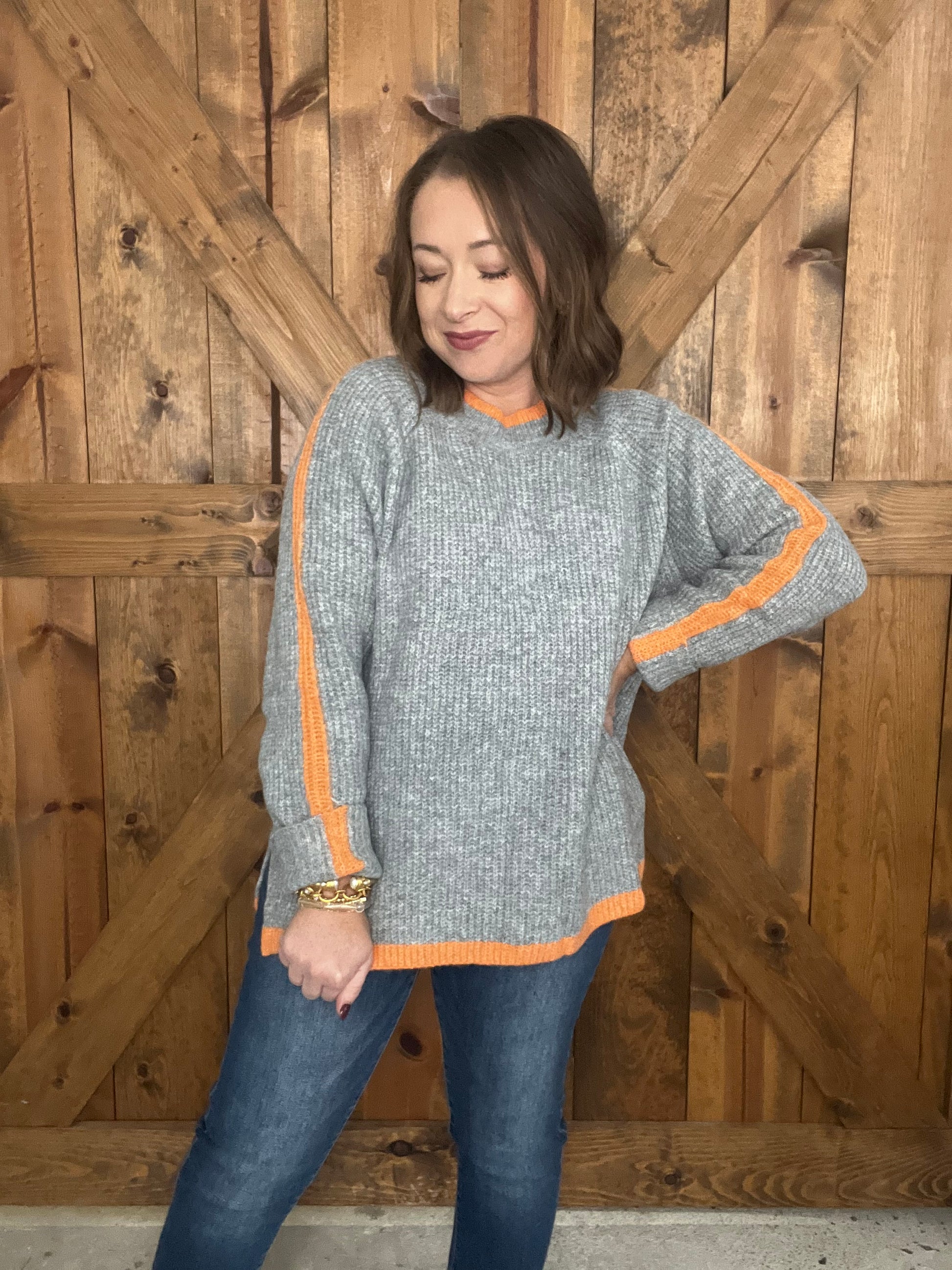 Make a statement with the Simple Delight Sweater, where understated elegance meets bold design. This grey long-sleeve top showcases a vibrant orange stripe contrast that catches the eye and sets you apart. Crafted for those who appreciate quality and style, it transitions seamlessly from work to weekend wear. The soft fabric feels as good as it looks, while the modern color blocking adds contemporary flair to your rotation. Layer it over basics or wear it standalone—either way, you'll enjoy a piece that's both comfortable and fashion-forward.