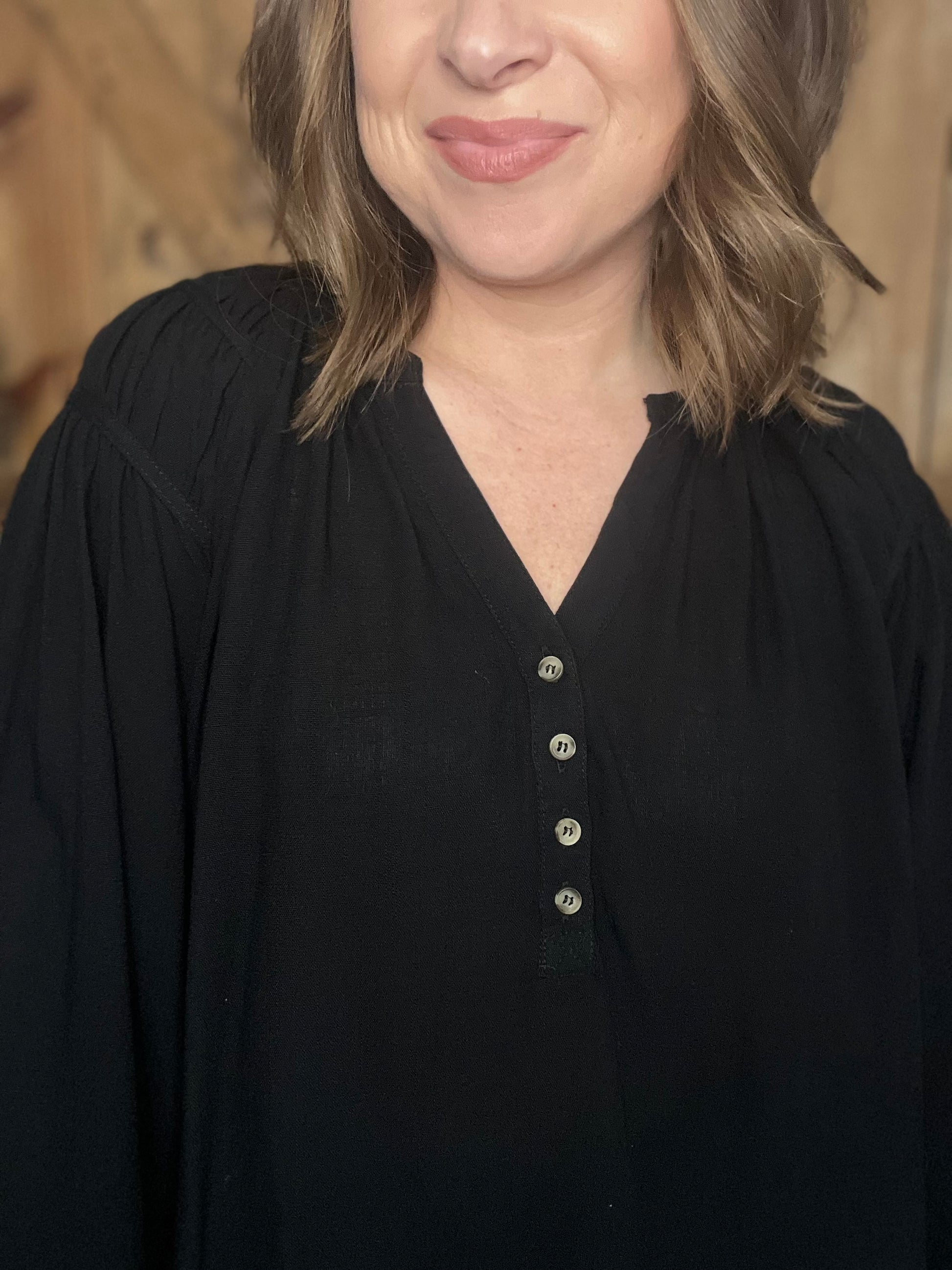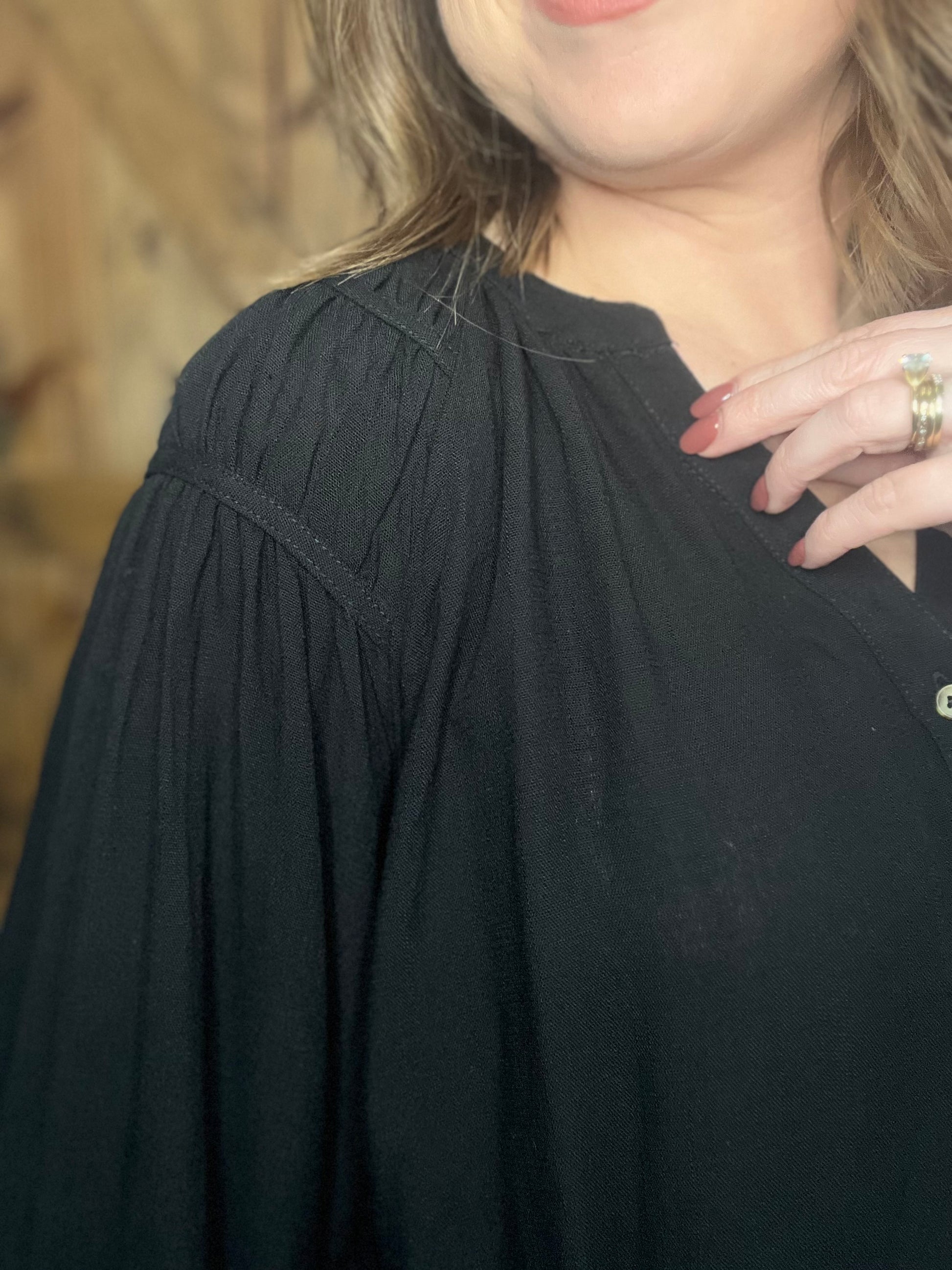 Meet your new wardrobe MVP—a long sleeve top that brings just the right amount of personality to your everyday rotation. The shirred shoulders add subtle dimension and visual interest, while the notched neckline keeps things modern and fresh. A structured placket runs down the front for that intentional, put-together vibe, and fitted cuffs ensure the sleeves stay exactly where you want them. Versatile enough to dress up or down, this piece is ready for whatever your day throws at it. Simple elegance has never been this fun.