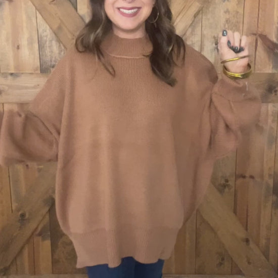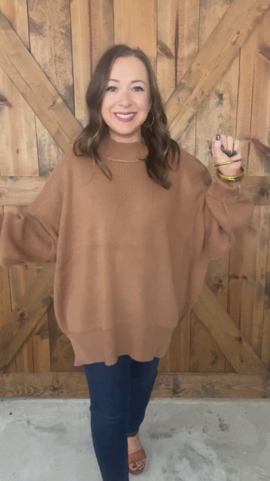 Stay cozy and stylish in the Snuggle Season Sweater! Featuring a side slit oversized fit and low gauge heavyweight knit, you'll love the slouchy comfy fit and ribbed detail. Plus, the slight mock neck will keep you warm during chilly days. Get ready for snuggle season!