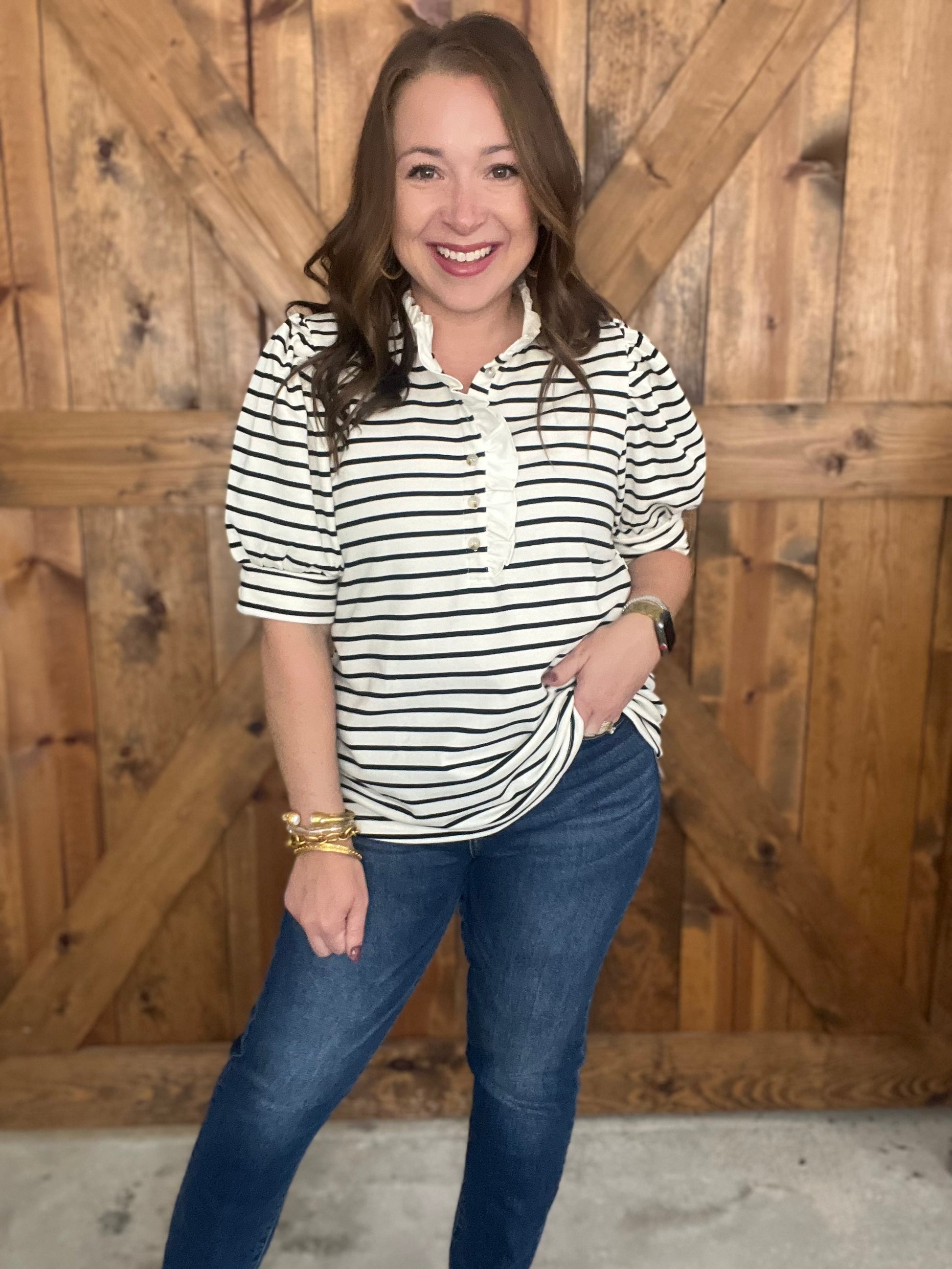 Play up your style with this playful Social Knit Top in cream and black. Featuring a charming stripe pattern, flirty short puff sleeves, and a contrast ruffle neck with button closure, it’s the perfect lightweight, non-sheer knit to brighten your day. Unlined for easy comfort, this top makes casual chic effortlessly fun.