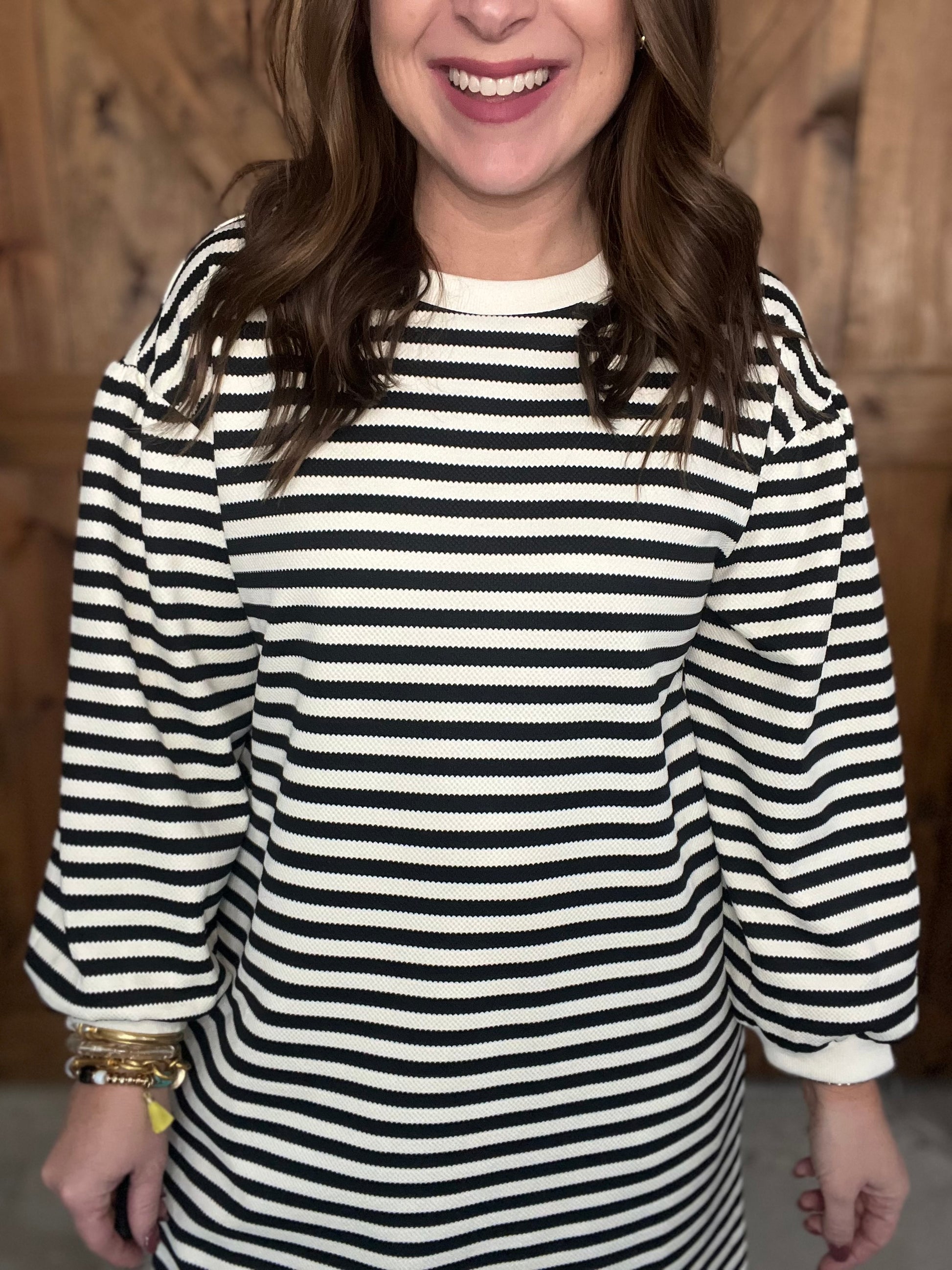 Get ready to turn heads in the Straight Away Dress in black! With its fun striped pattern, cozy crew neck, and trendy drop shoulders, this lightweight dress keeps comfort at the forefront. The puffed three-quarter sleeves add a whimsical touch, while practical side pockets and stylish band cuffs make it as functional as it is playful. Perfect for days when you want to feel effortlessly cool and confident.