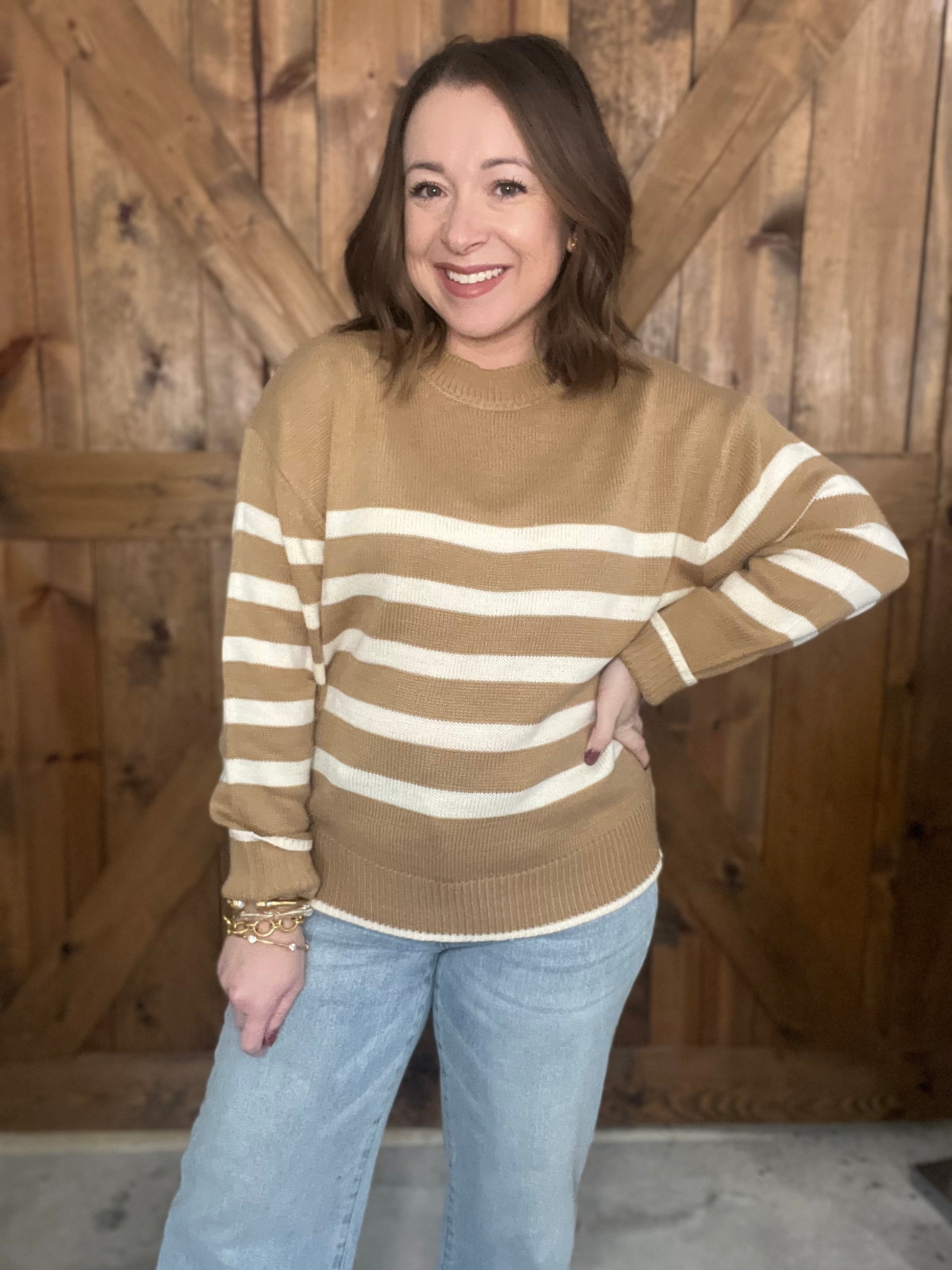 This taupe striped crew neck sweater is your new go-to for laid-back vibes. The classic stripe design works overtime—dress it down with your favorite distressed denim for weekend wandering, or throw it over a crisp button-up when you need to look put-together without trying too hard. The relaxed fit keeps things comfy whether you're heading to the office or just hanging out, making it the perfect piece for those in-between seasons when you can't decide what to wear.