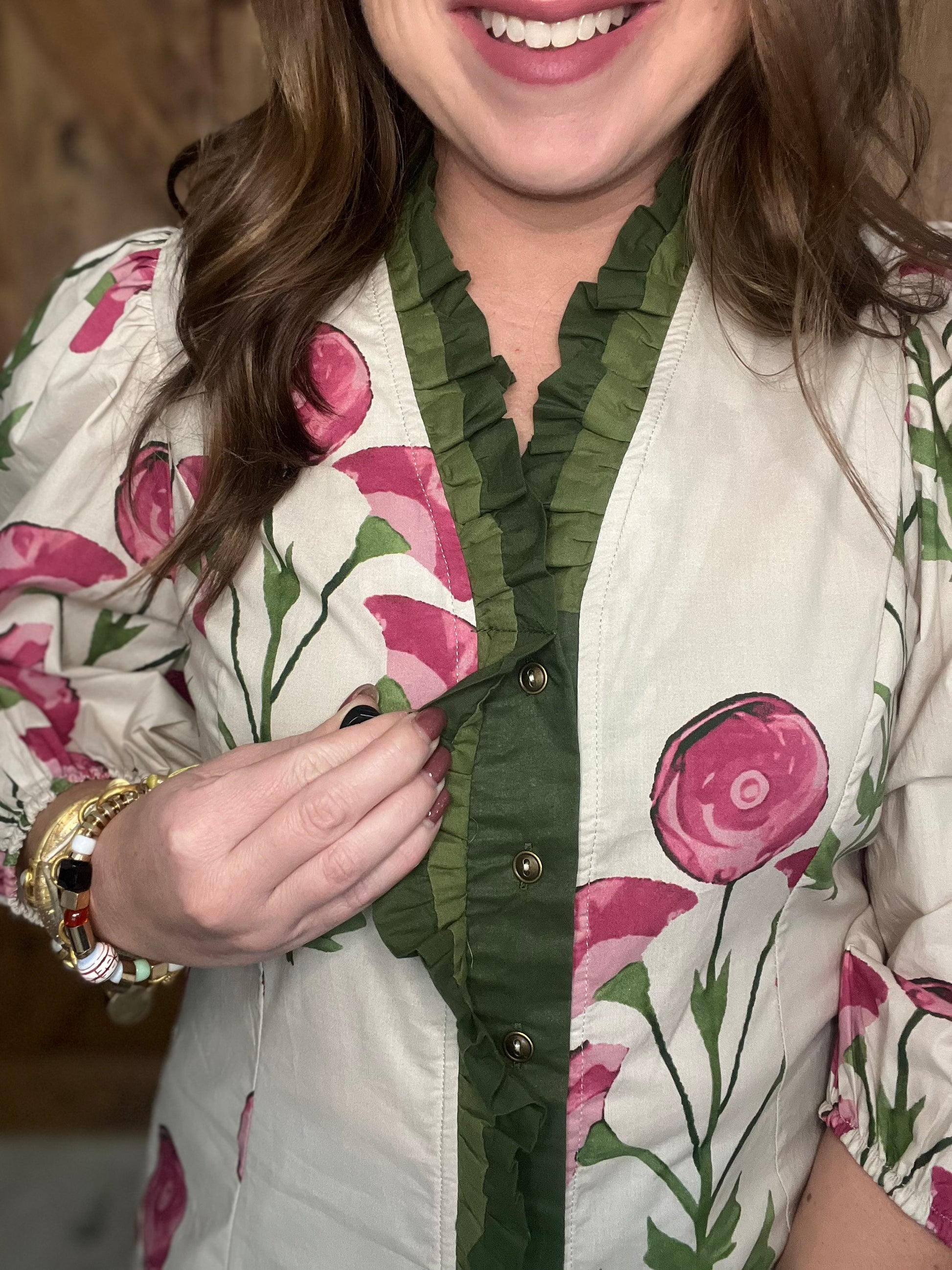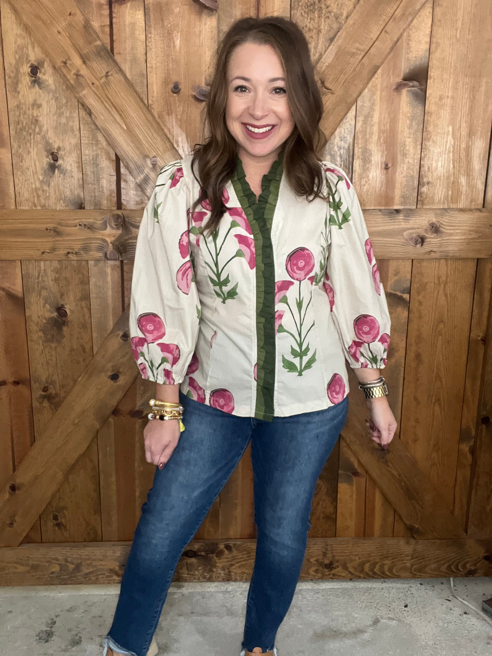The Bloom Top - Stone is a playful wardrobe favorite featuring a cheerful floral print and a flirty split V-neck. Its 3/4 puff sleeves add a charming touch, while the straight hem with a contrasting edge keeps things fresh and fun. Lightweight and unlined, this top is perfect for breezy days and effortless style.
