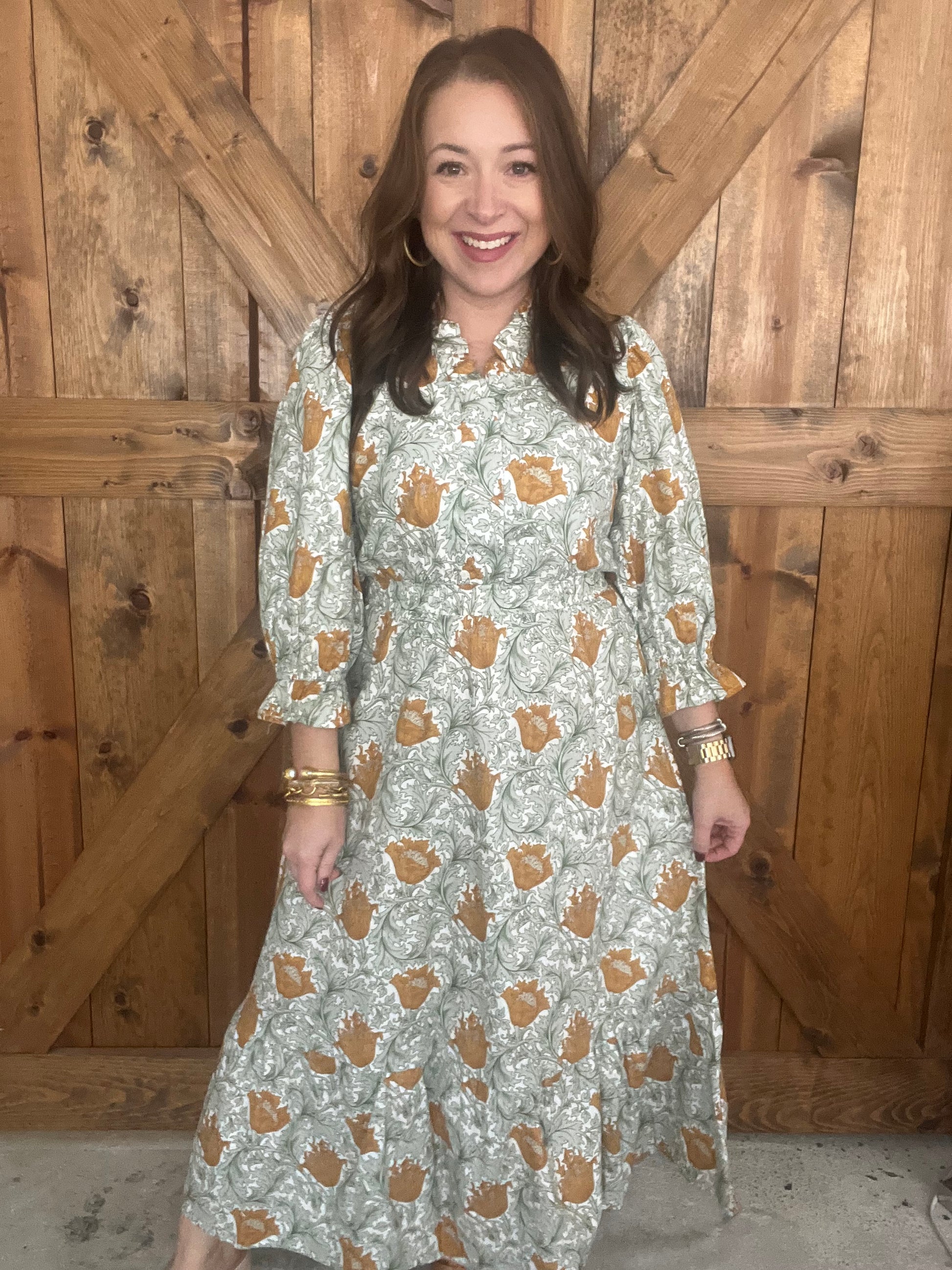 The Waverly Dress in green brings playful elegance to your wardrobe. Its V-neck with a stand collar adds a touch of charm, while 3/4 sleeves with elastic ruffle cuffs keep things fun and flirty. The elasticized waist shapes your silhouette, and the midi length with a subtle tiered flare invites you to twirl with joy. Light and breezy without lining, it’s perfect for carefree days and lively nights.