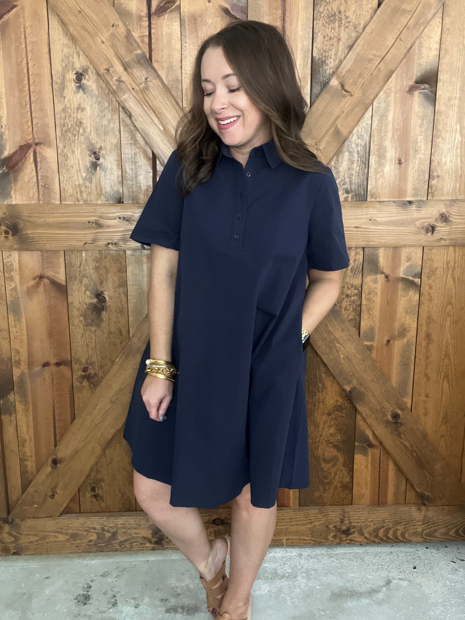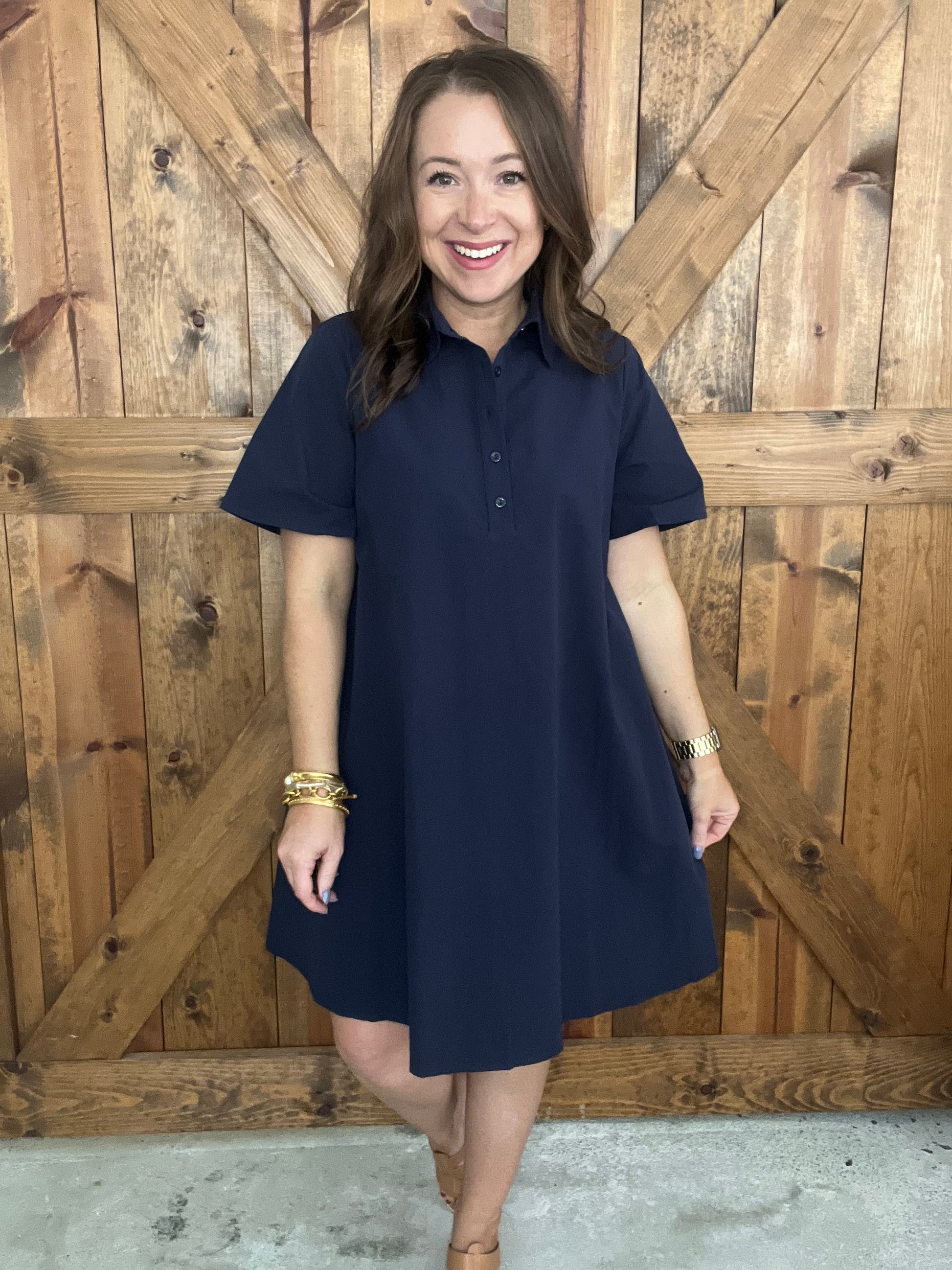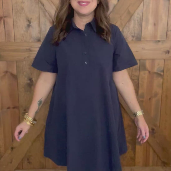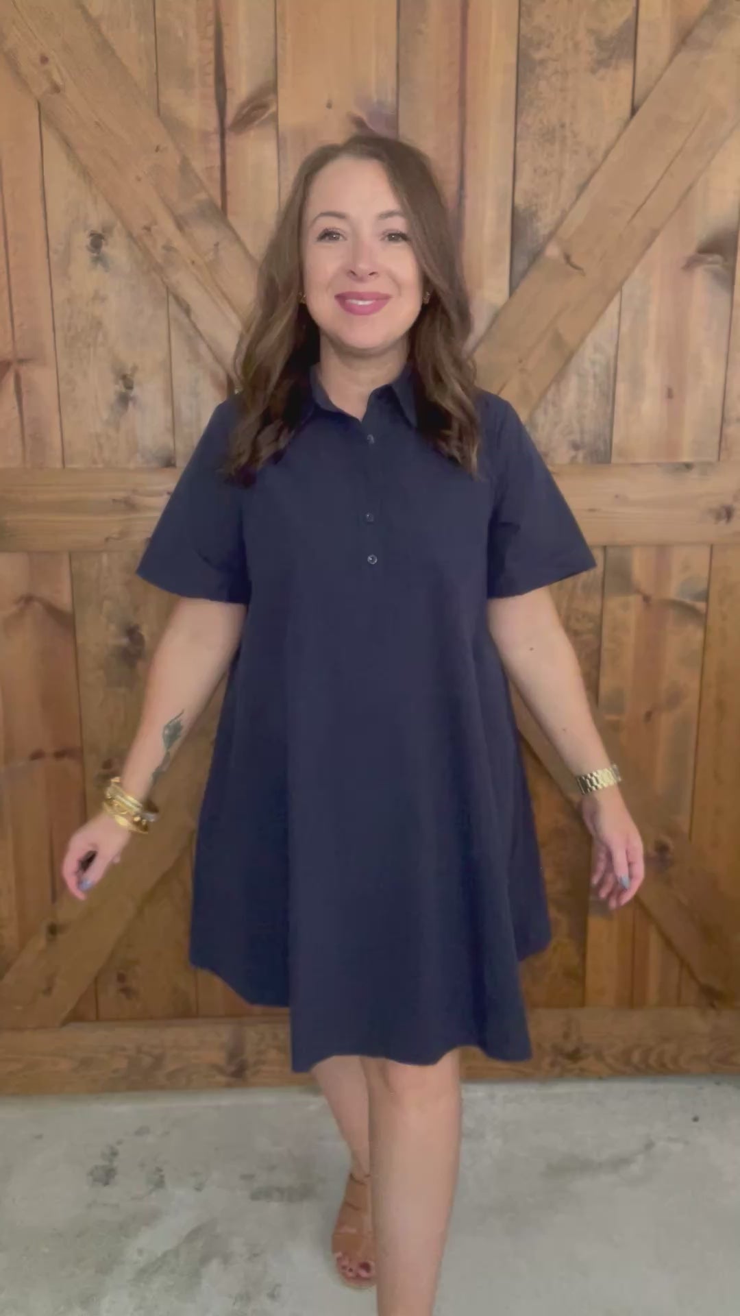 Crafted from crisp poplin woven fabric, the Turn It Around Dress in Navy offers a fresh take on classic style. Its short sleeves and collar detail create a polished look, while the quarter front placket with button closure adds subtle sophistication. The inverted pleat on the back enhances movement and comfort, making this mini-length dress perfect for day-to-night wear. Embrace effortless elegance with a design that turns heads wherever you go.