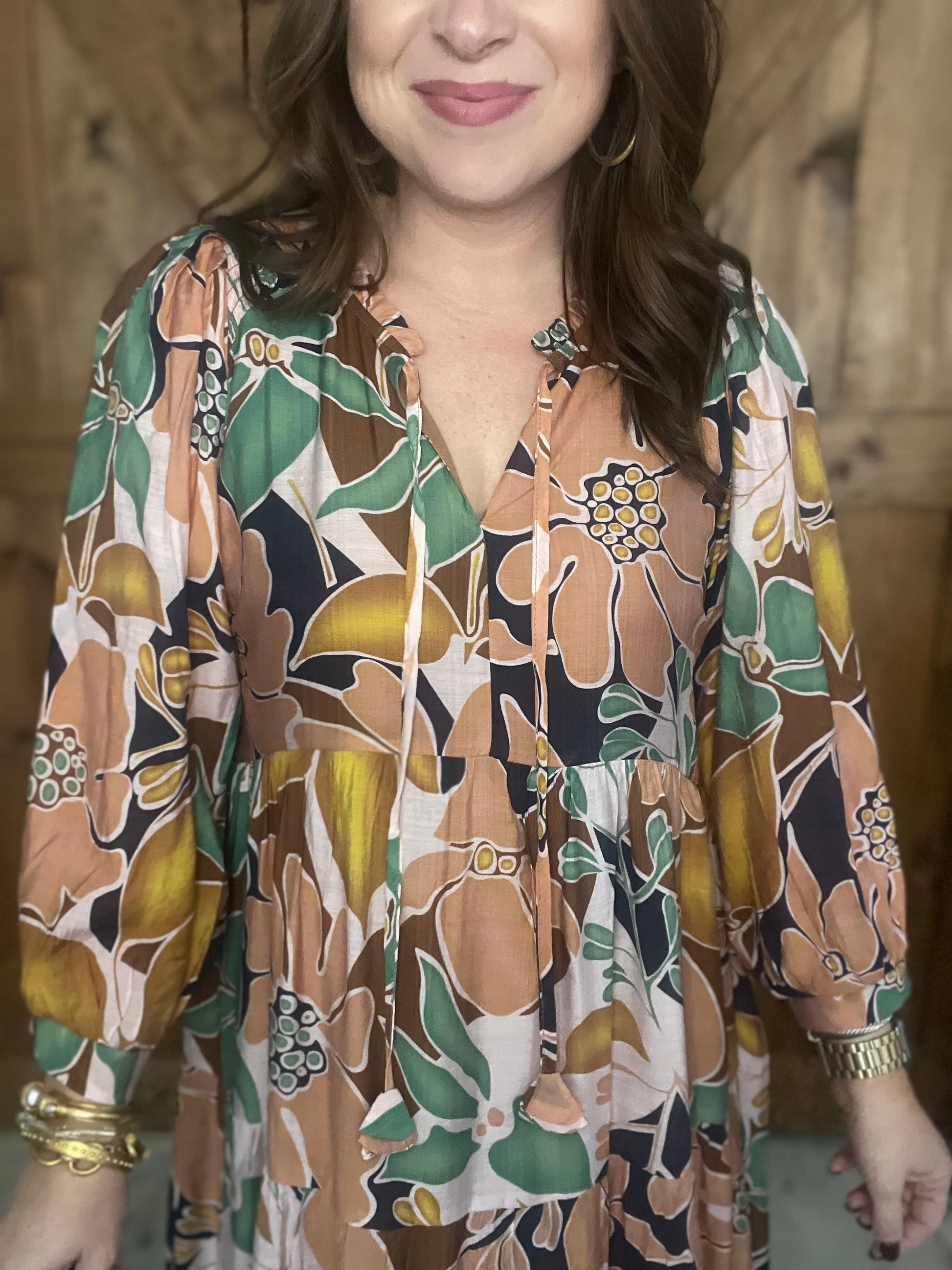The Waves of Grace Dress in Blue Mix captures a fun retro vibe with its round neckline, playful tie and tassel detail, and charming 3/4 puff sleeves finished with elastic cuffs. Its tiered midi length creates a flirty, flowing silhouette perfect for twirling through your day. Lightweight and unlined, it offers breathable comfort with every step. This dress brings a delightful splash of vintage-inspired style to your wardrobe with a fresh, spirited twist.