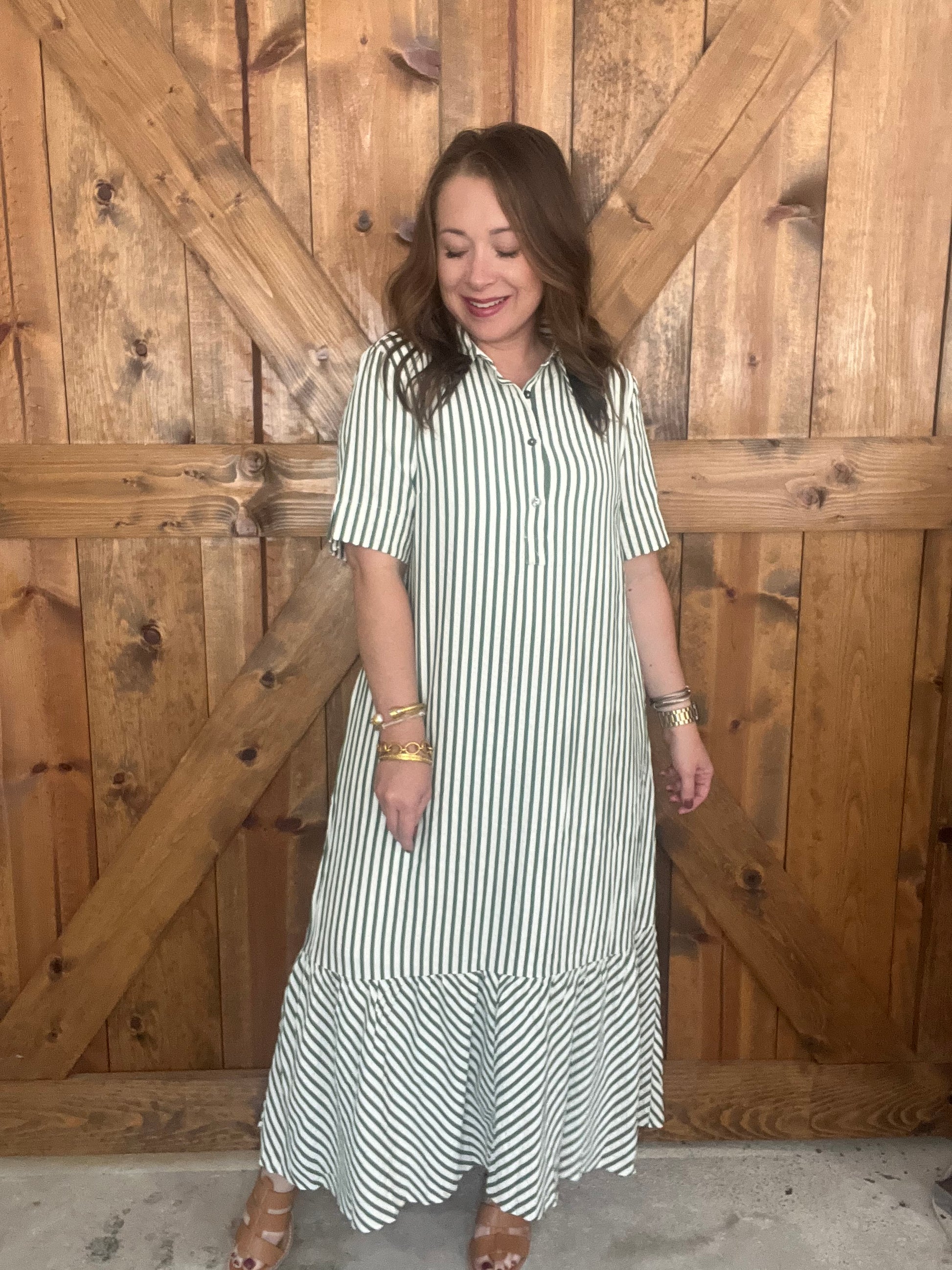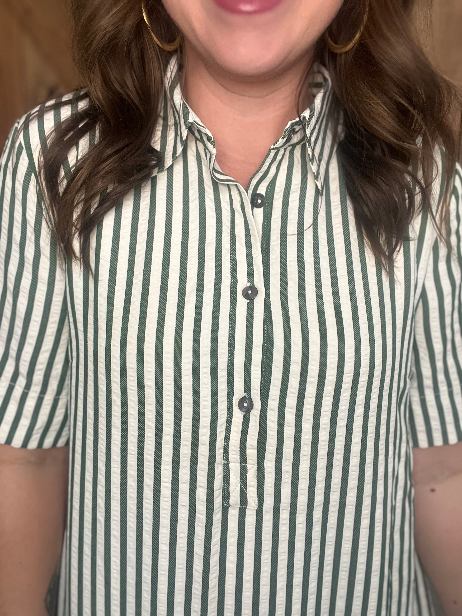 Bring a breezy charm to your wardrobe with the Whispering Pines Dress. This playful midi dress features a classic stripe pattern on lightweight, woven seersucker fabric that's perfect for warm days. The sweet ruffle hem and collar with button-front closure add flirty details, while side pockets keep essentials close. Fully lined and non-sheer, it offers comfort and coverage wherever your day takes you.
